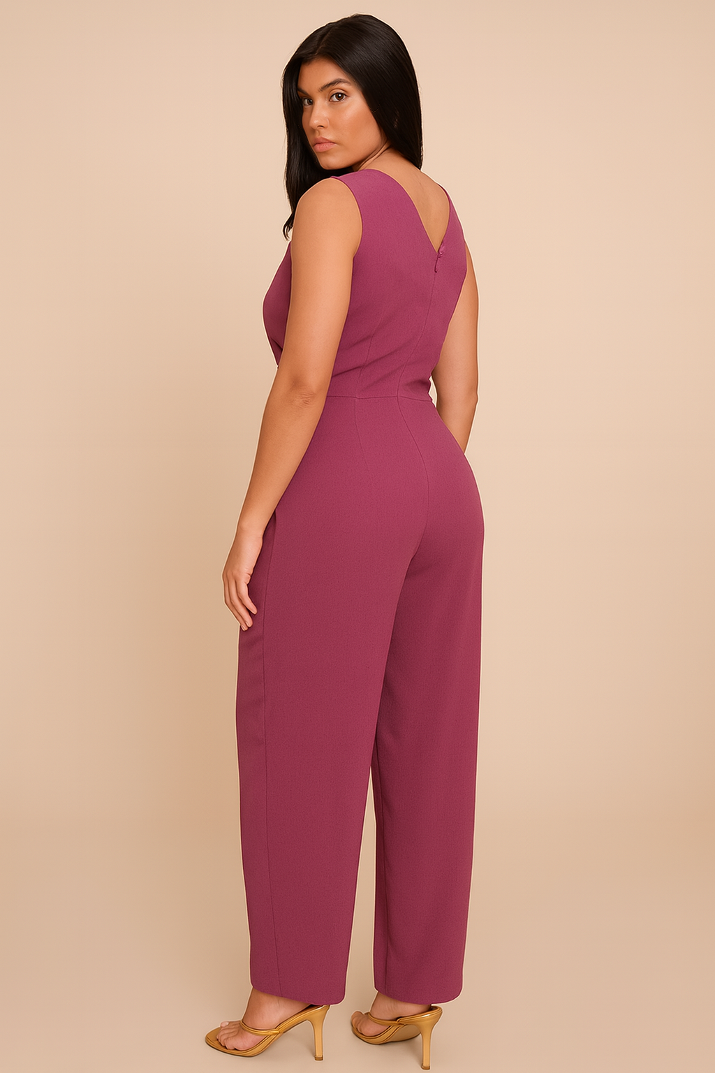 Chic and flattering, this plum wrap jumpsuit features a sleeveless design with a deep V-neckline and a side tie waist for a graceful silhouette. Perfect for both daytime events and evening outings.