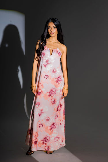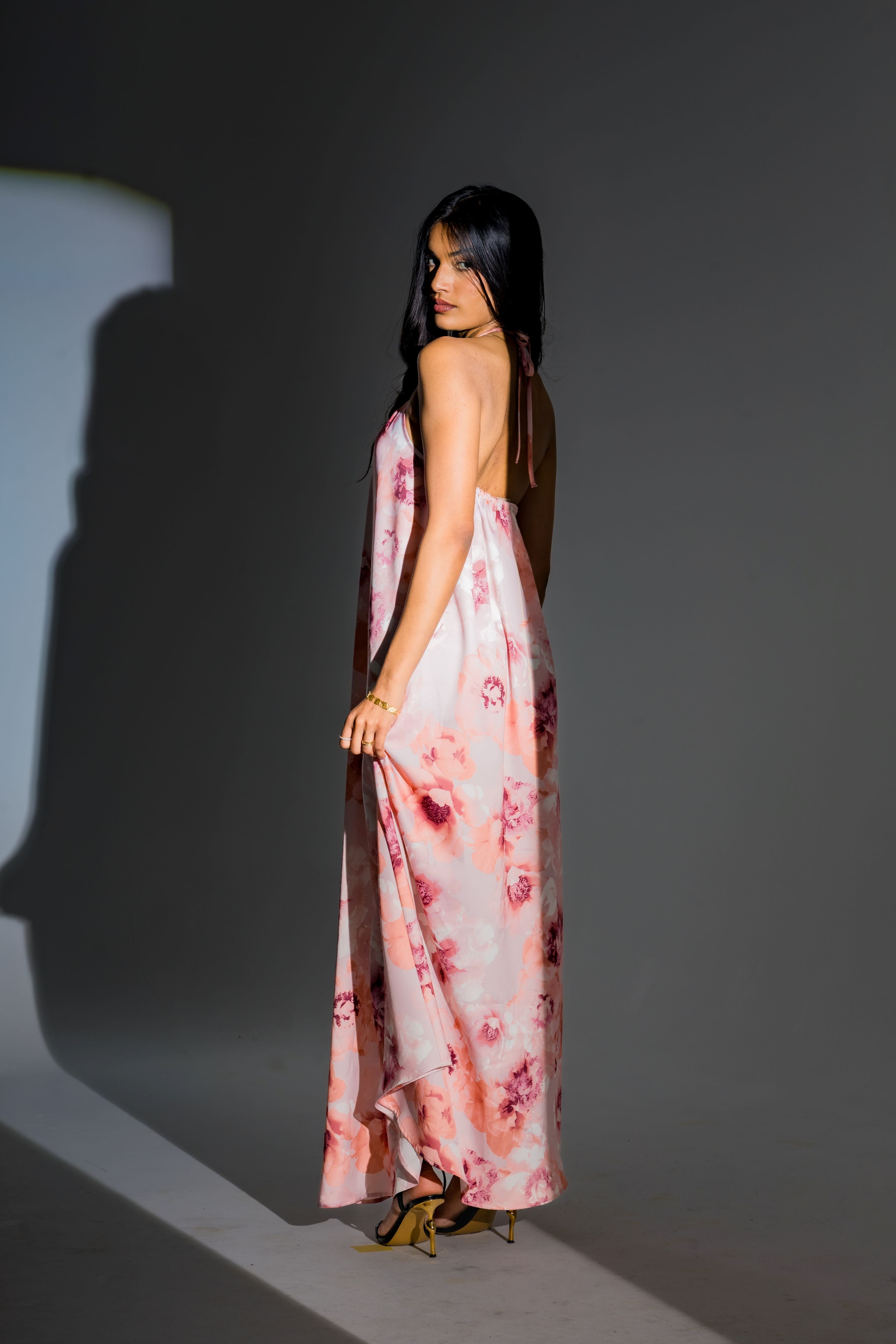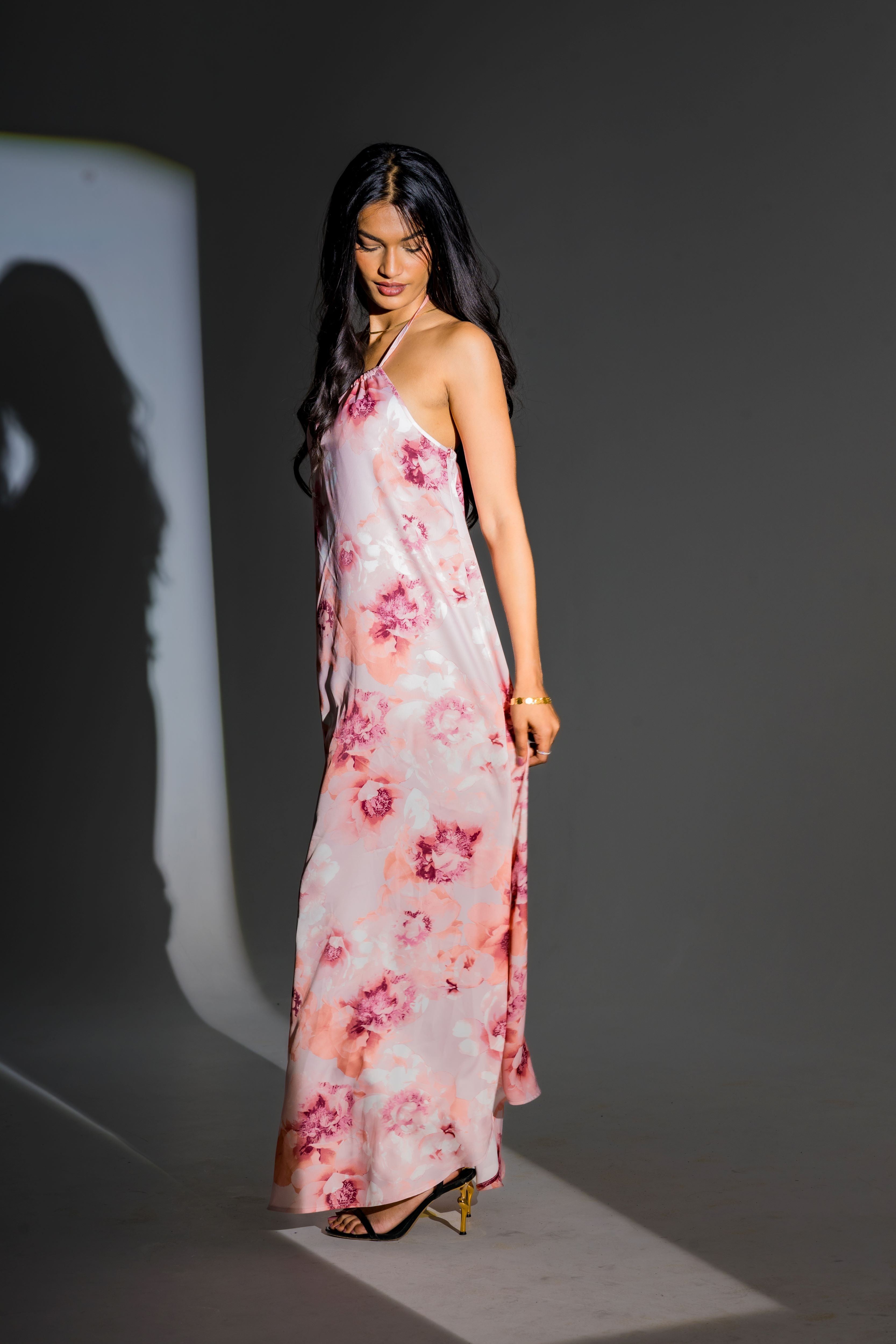 Embrace the essence of romance and summer charm with this exquisite maxi dress. Featuring a delicate blush pink base adorned with a beautiful floral print in shades of deeper pink, rose, and hints of peach, this dress exudes feminine grace. The elegant halter neckline beautifully highlights the shoulders and décolletage, complemented by a subtle keyhole detail at the bust for an alluring touch.