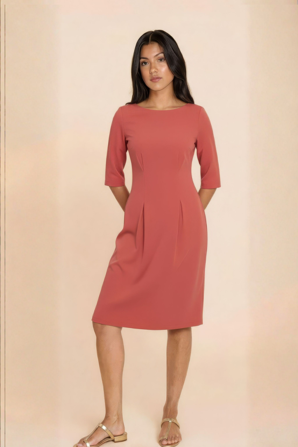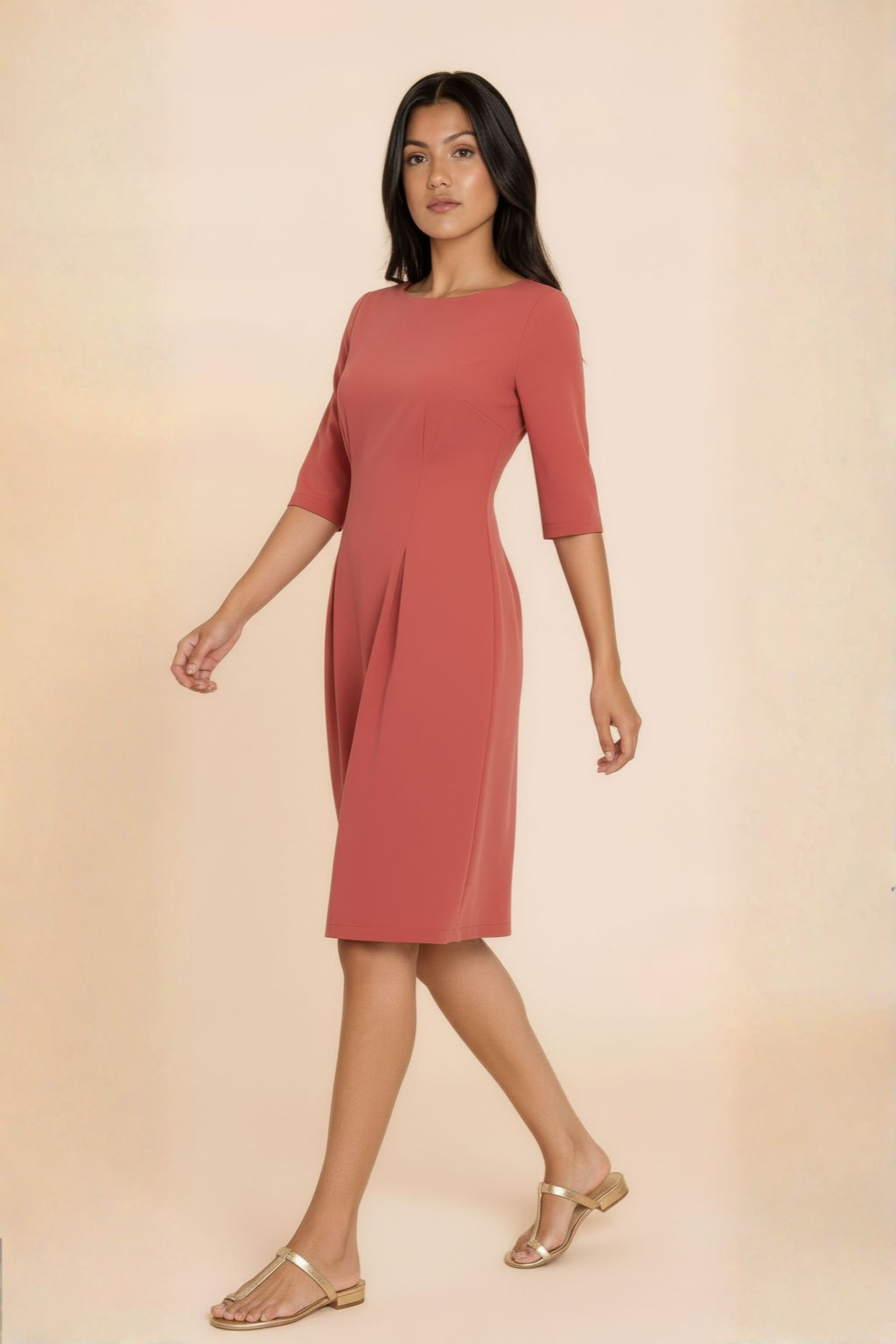 The design features a classic boat neckline and three-quarter sleeves, ensuring a polished and comfortable fit for all-day wear. The waist is carefully darted and fitted to provide an incredibly flattering silhouette, while subtle inverted pleats below the waistline offer structure and ease of movement through the skirt. Hitting perfectly at the knee or just below, this dress is the epitome of work-to-event versatility.