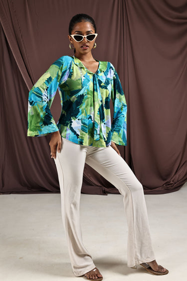 "Make a statement with our ""Abstract Oasis Blouse"" This stunning long-sleeved top captivates with its dynamic abstract print, a beautiful blend of invigorating blues, lush greens, and subtle hints of lavender. Designed for effortless styling, it features a unique notched collar and a graceful tie-front detail, creating a chic V neck silhouette.