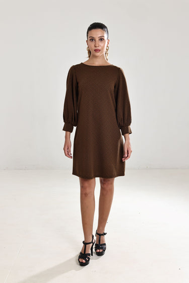 "The relaxed silhouette is effortlessly stylish, while the voluminous balloon sleeves with gathered cuffs bring a playful yet polished vibe. Designed with a high neckline and above-the-knee hem, this dress is perfect for both daytime outings and evening socials.