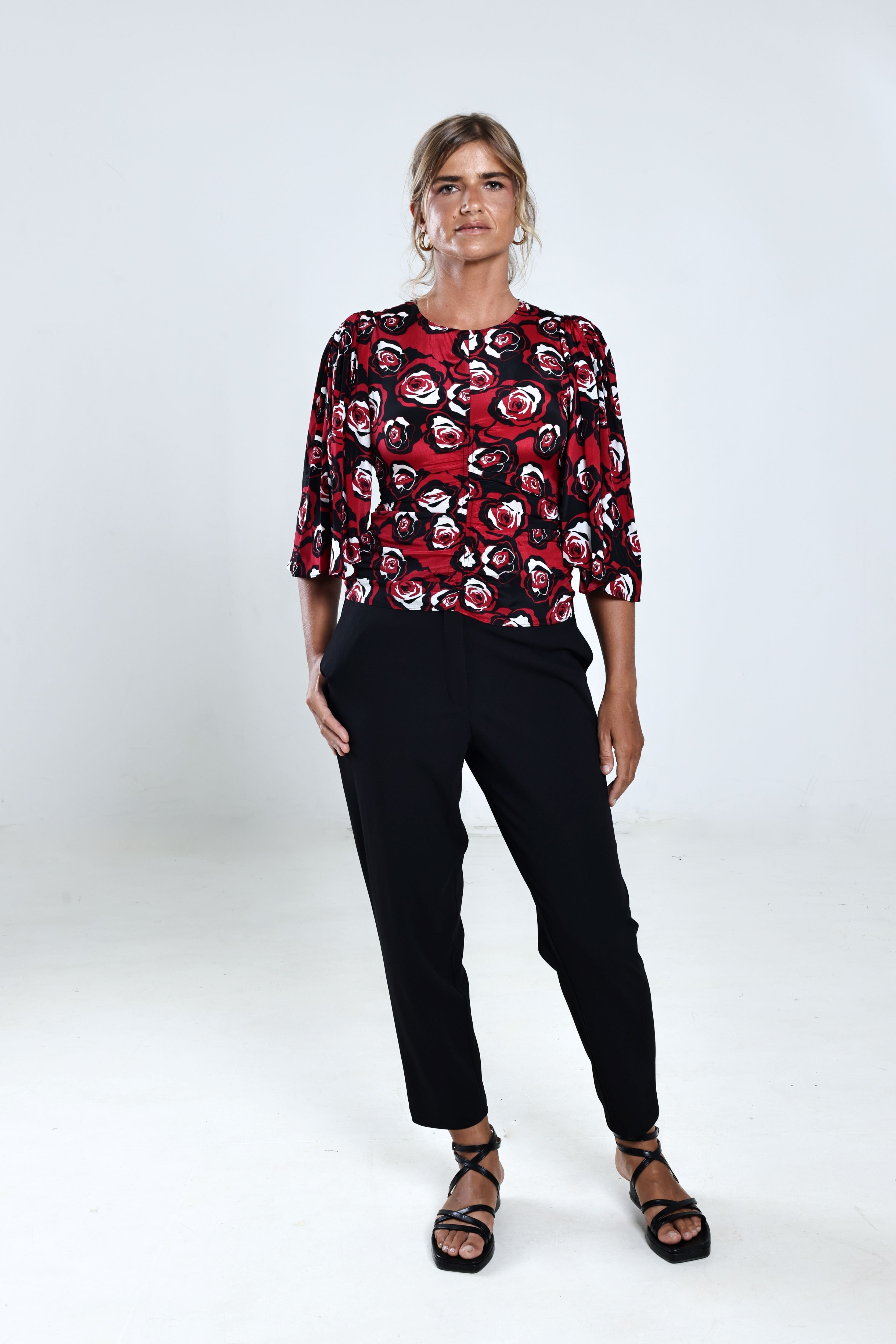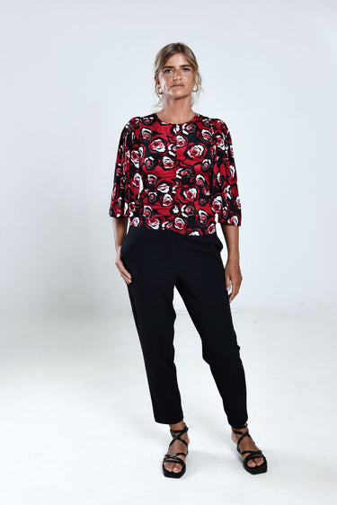 "Make a striking statement in our Evening kiss Top. This vibrant piece features a captivating print of bold red and black roses with white accents, creating an eye-catching design. With its comfortable round neckline and flattering elbow-length dolman sleeves, this top offers a relaxed yet stylish fit. Perfect for adding a pop of colour and personality to your jeans, trousers, or skirts for any casual or smart-casual occasion.