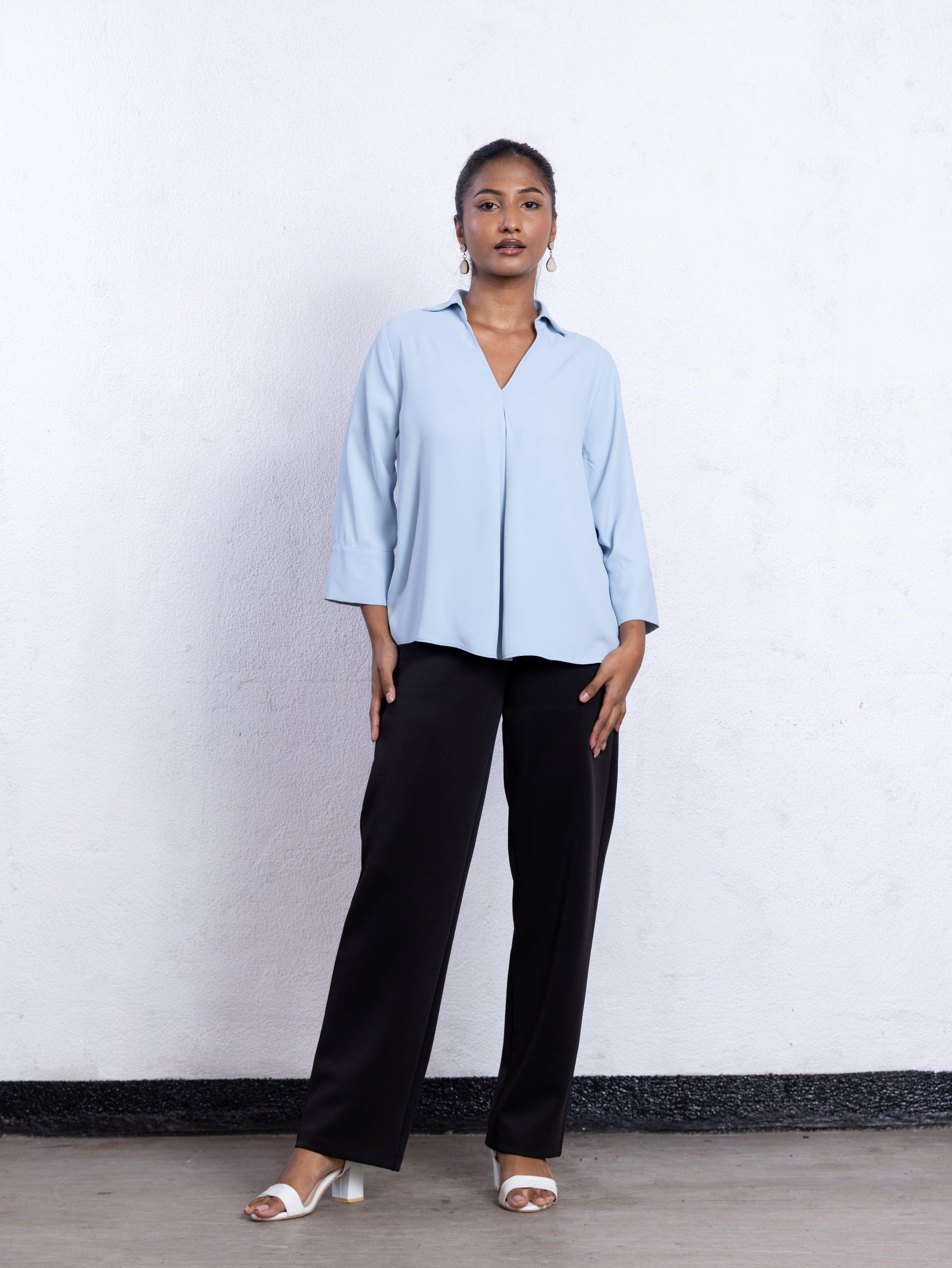Presenting our Henry sky blue top suited for office and formal parties, blends well with a Ponte pant or a formal skirt, highlights you at the dark indoor theme.