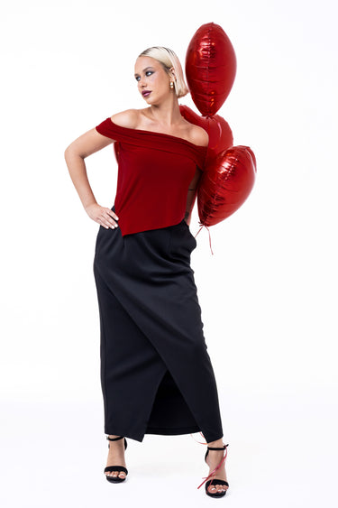 Designed with a striking off-the-shoulder neckline, this piece elegantly frames the collarbone for a look that is both romantic and modern. The asymmetrical hemline adds a contemporary architectural touch, while the rich red fabric offers a soft, figure-skimming fit.