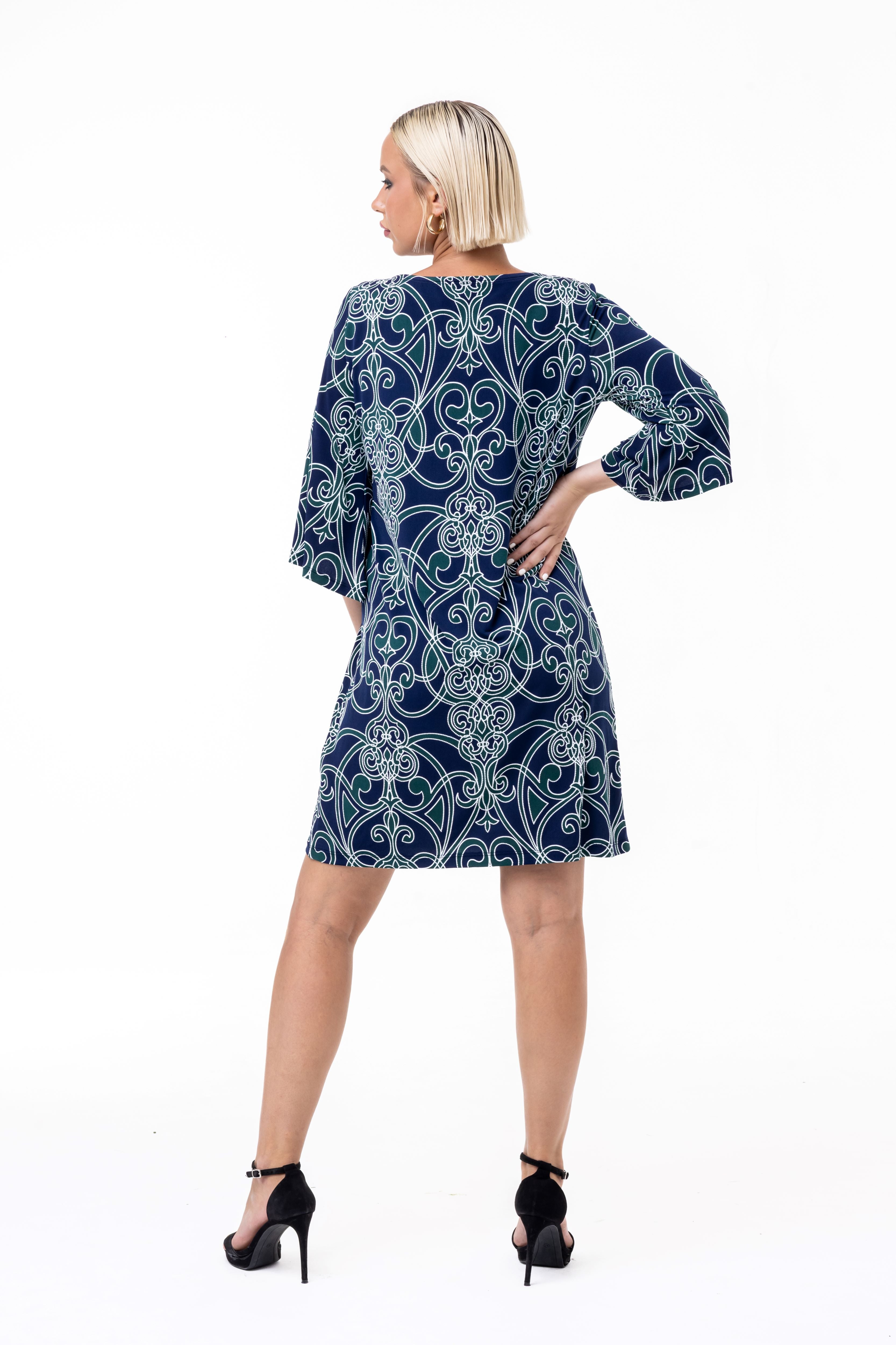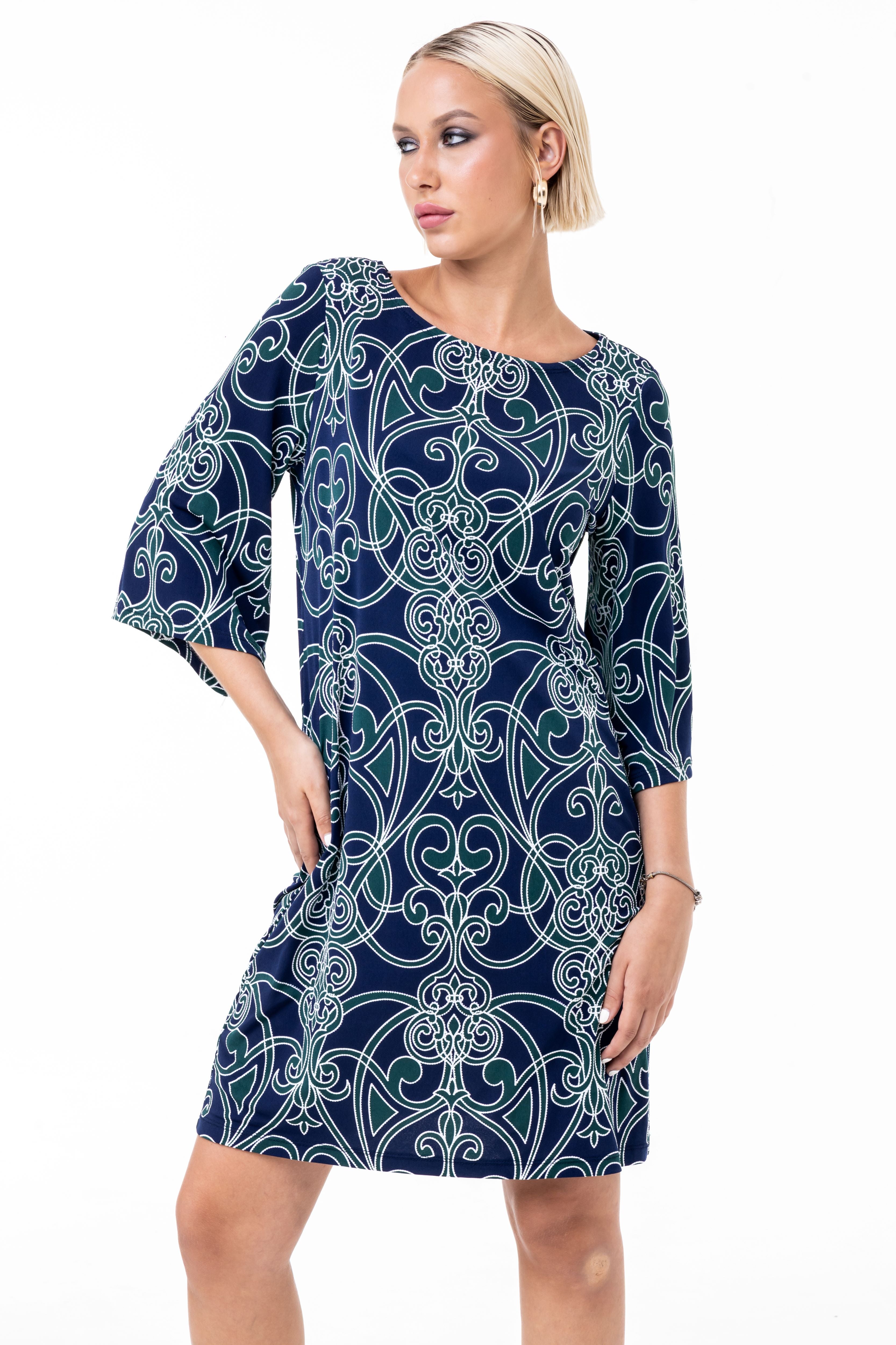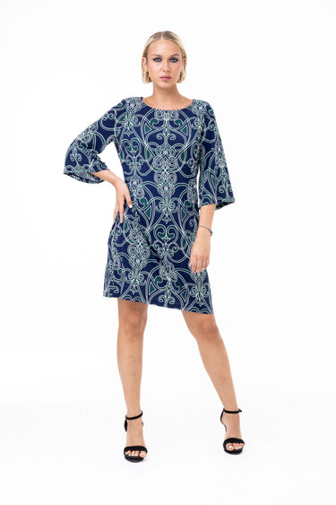 Sophistication is in the details. This printed shift dress features a captivating, all-over ornate scroll motif in deep navy and forest green, highlighted by crisp white linework. The structured yet comfortable silhouette is elevated by dramatic bell sleeves, making it a perfect transition piece that brings artistic elegance to your everyday rotation.