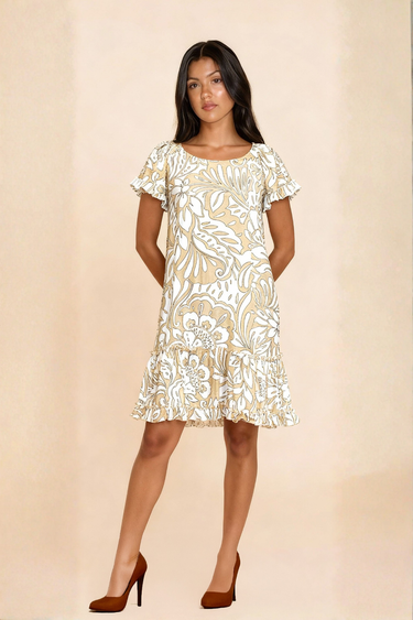 Capture the essence of a sun-drenched getaway in the Alani Floral Ruffle Dress. Crafted from a lightweight, breathable fabric, this dress features a stunning sand and ivory tropical print that's as eye-catching as it is timeless. The relaxed, shift silhouette ensures all-day comfort, while delicate details like the subtle gathering at the neckline, flounce sleeves, and playful tiered ruffle hem add a touch of feminine charm