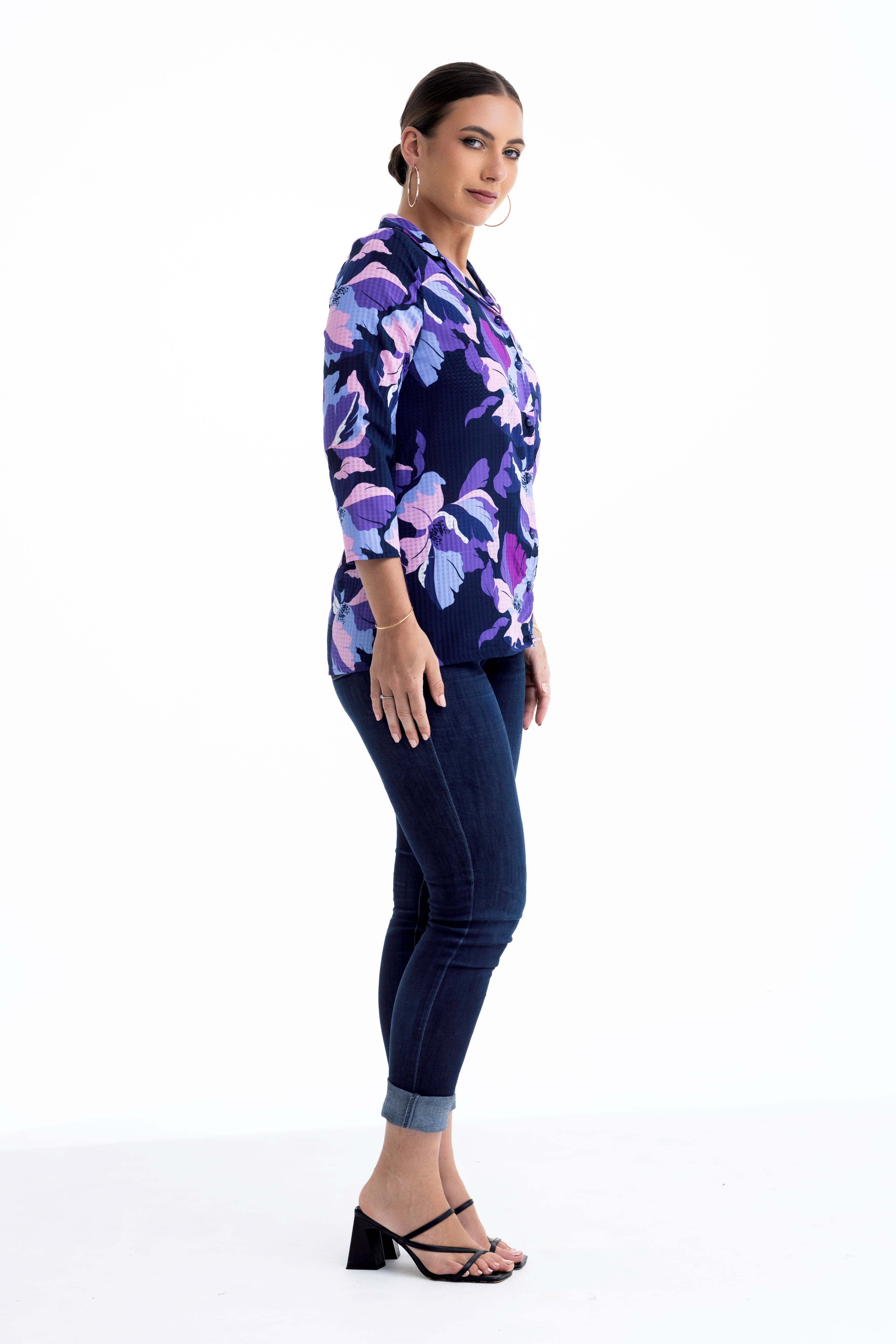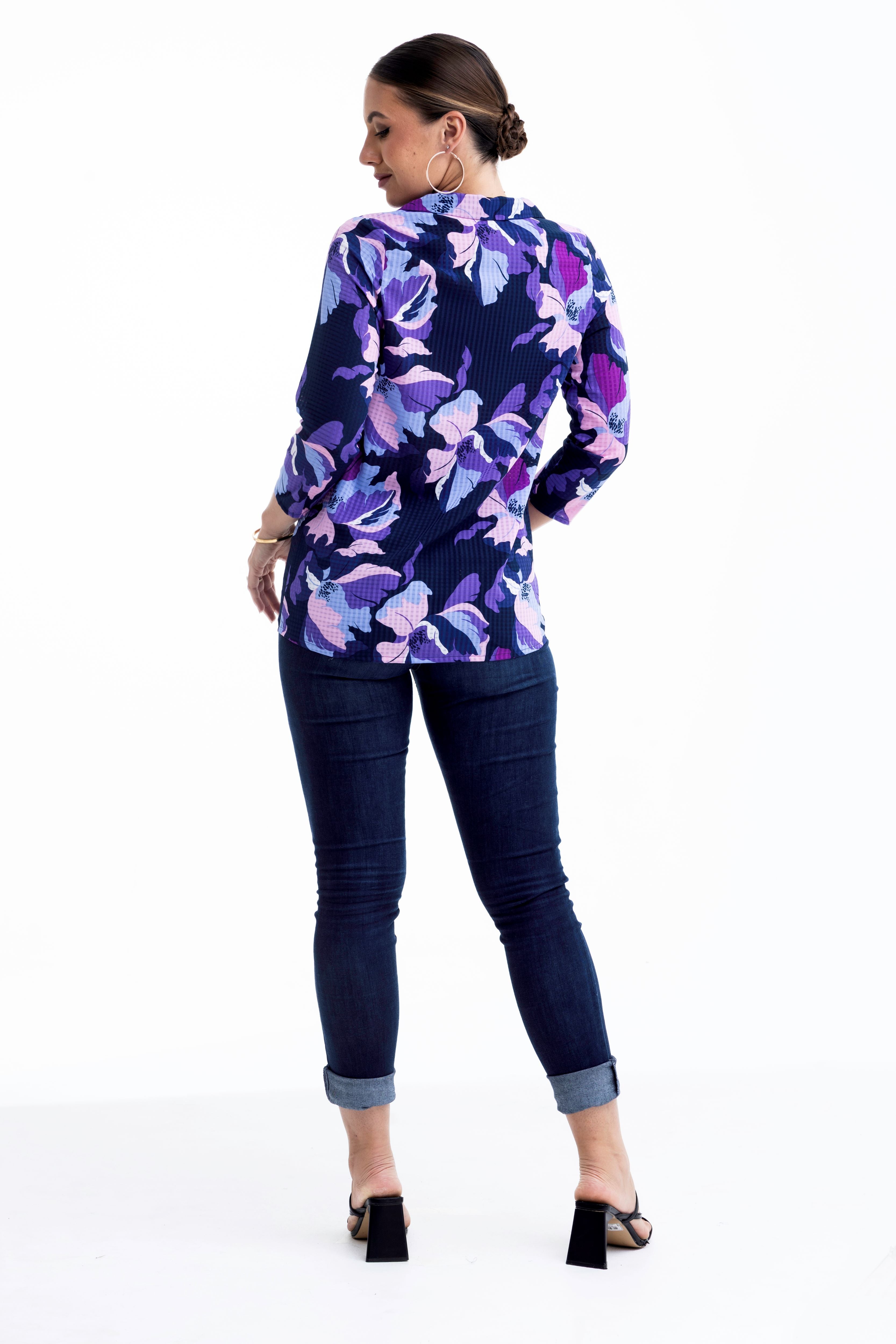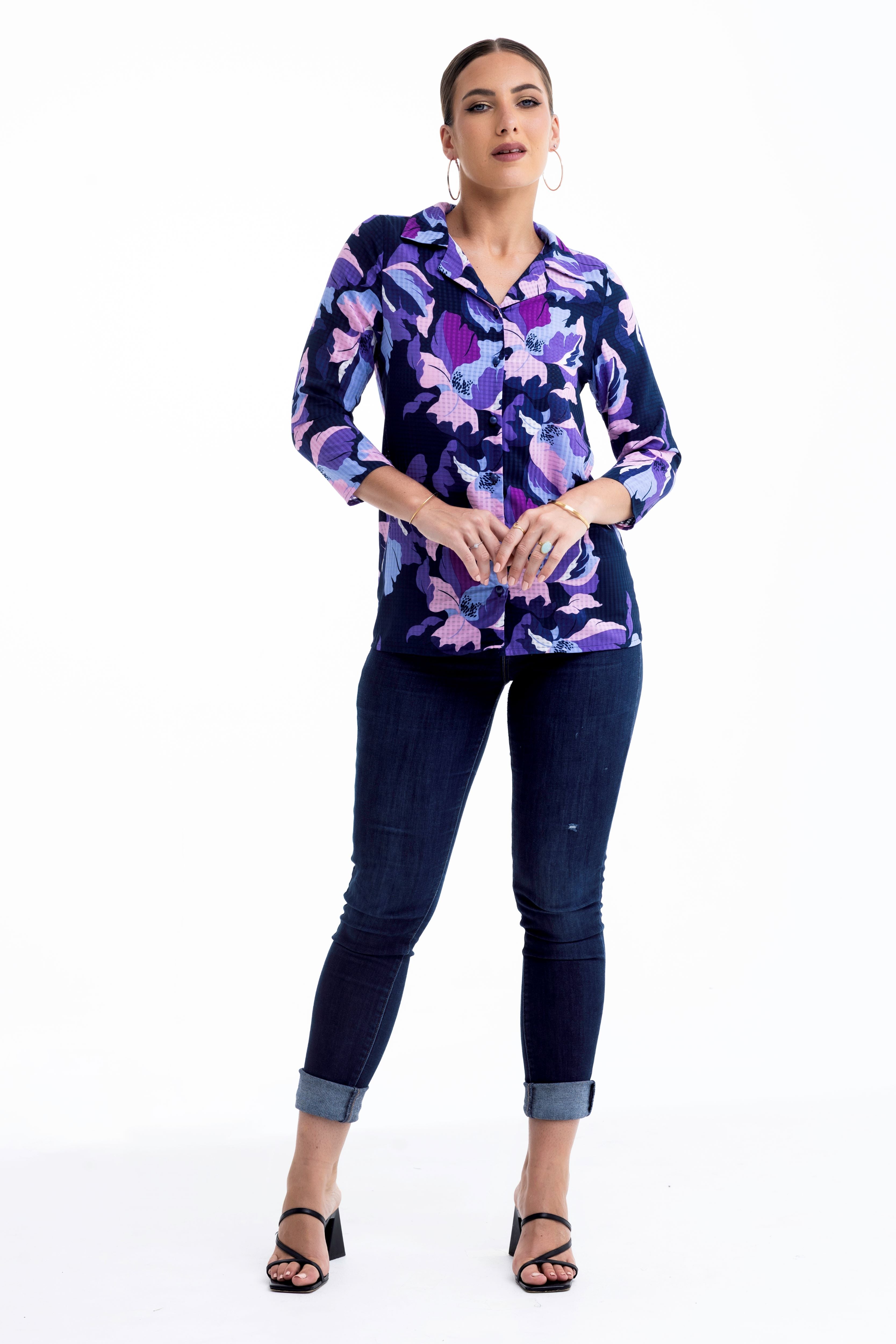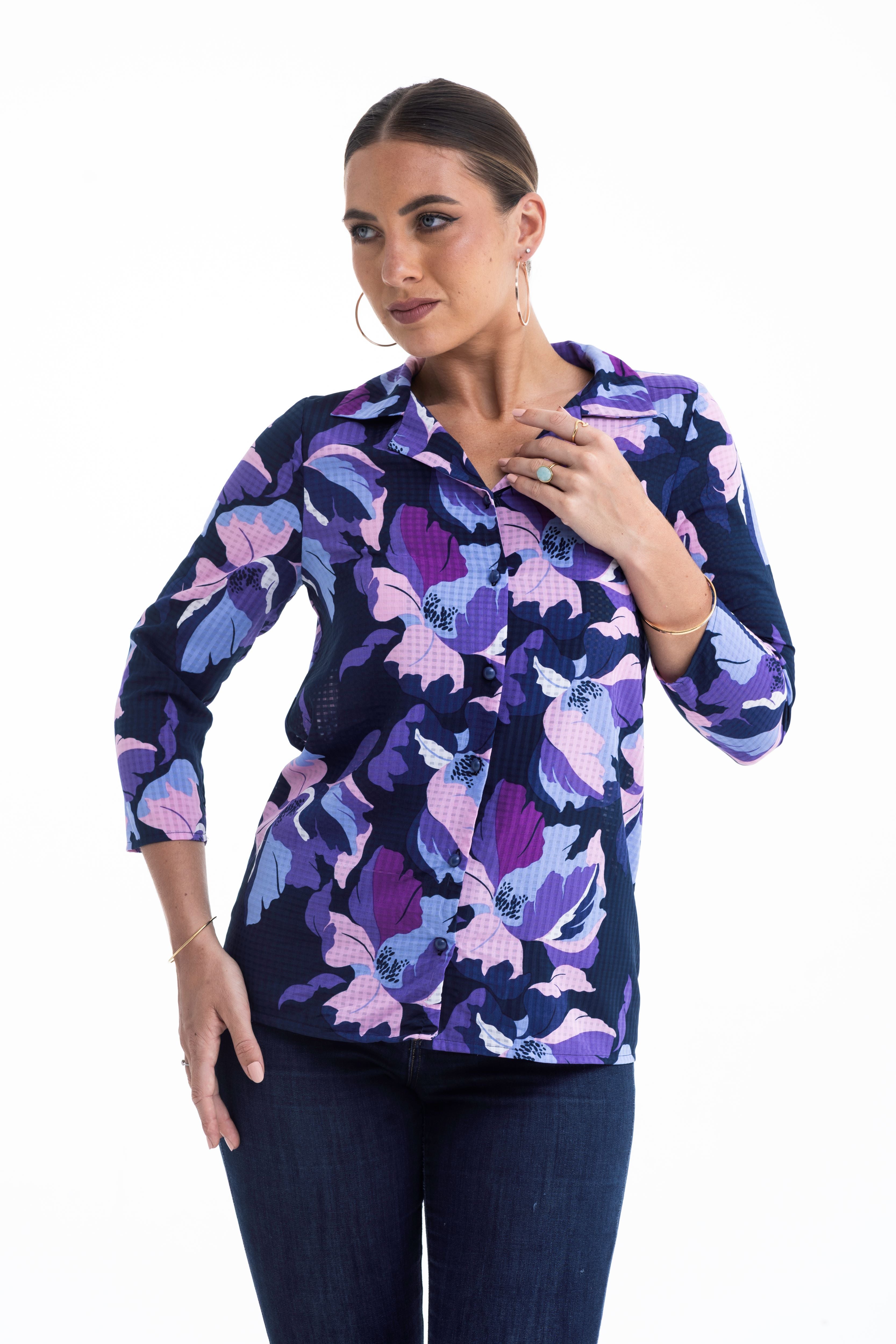 Make a statement in shades of amethyst and indigo. This vibrant button-down reimagines the classic shirt silhouette with a bold, oversized floral print and a unique textured finish. Whether you're layering it under a blazer or wearing it as the centrepiece of your outfit, its rich colours and feminine details offer an instant confidence boost.