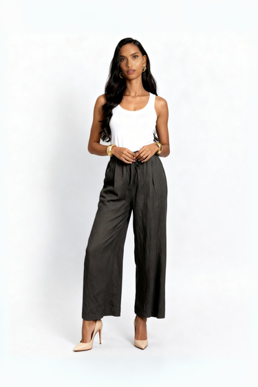 Comfort meets chic! These high-waisted, wide-leg trousers in dark grey have a flowing fit and an adjustable drawstring waist. Lightweight fabric makes them perfect for warmer weather. Dress them up or down!