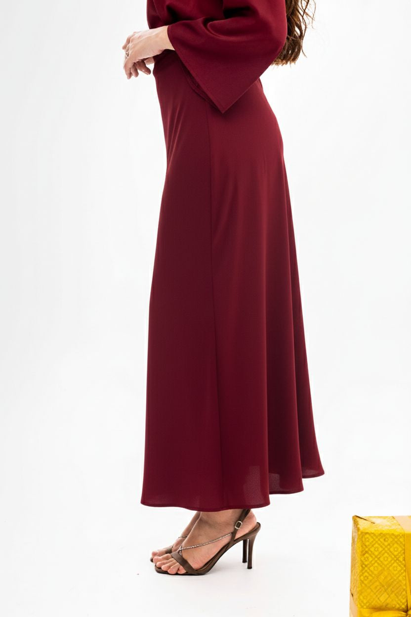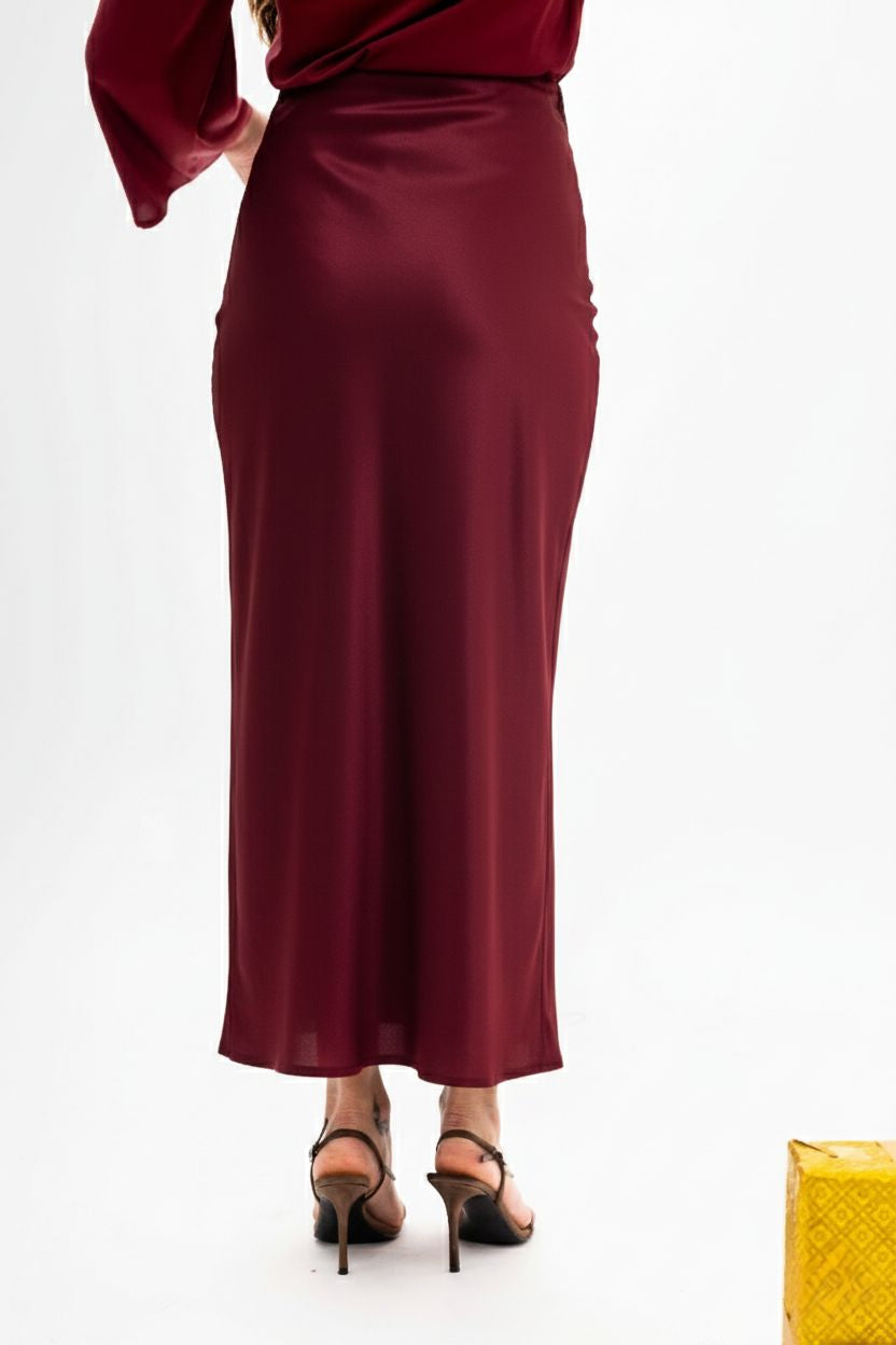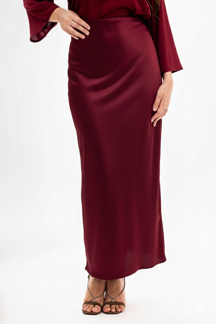 The Cherry Flute Maxi Skirt is an indispensable piece for achieving a polished, high-fashion look. The sleek, straight silhouette falls gracefully to a maxi length, offering an air of sophisticated drama. Made from a premium, flowing satin, it features a subtle sheen that transitions perfectly from day to evening.