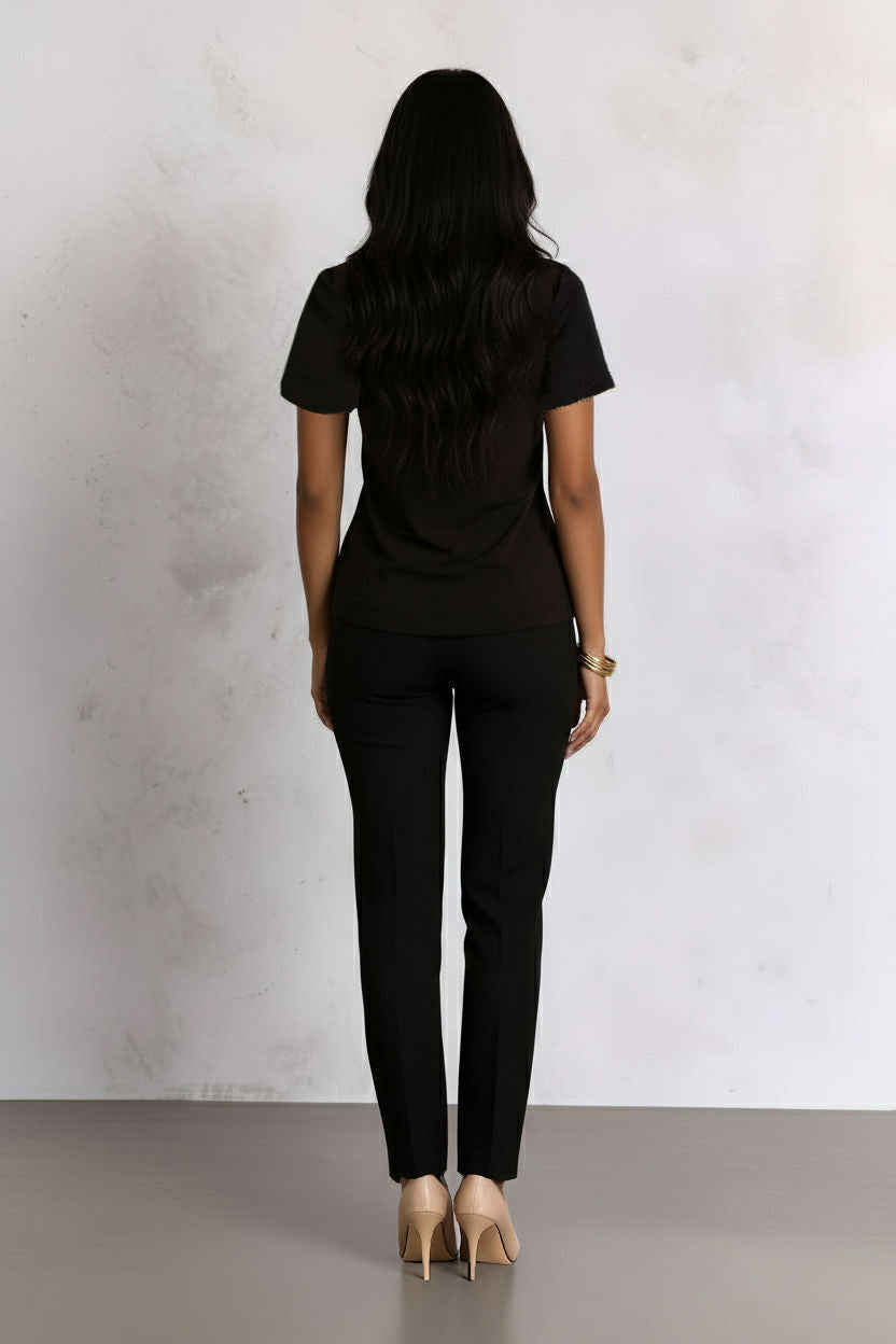 The Duality Asymmetrical Top is designed for the woman who appreciates architecture in her fashion. This top masters the art of contrast, featuring a split-front design where one side is a smooth, slimming black and the other is a vibrant, patterned chartreuse and dark-tone print. The unique placement of the decorative buttons draws the eye and enhances the tailored, structured fit.