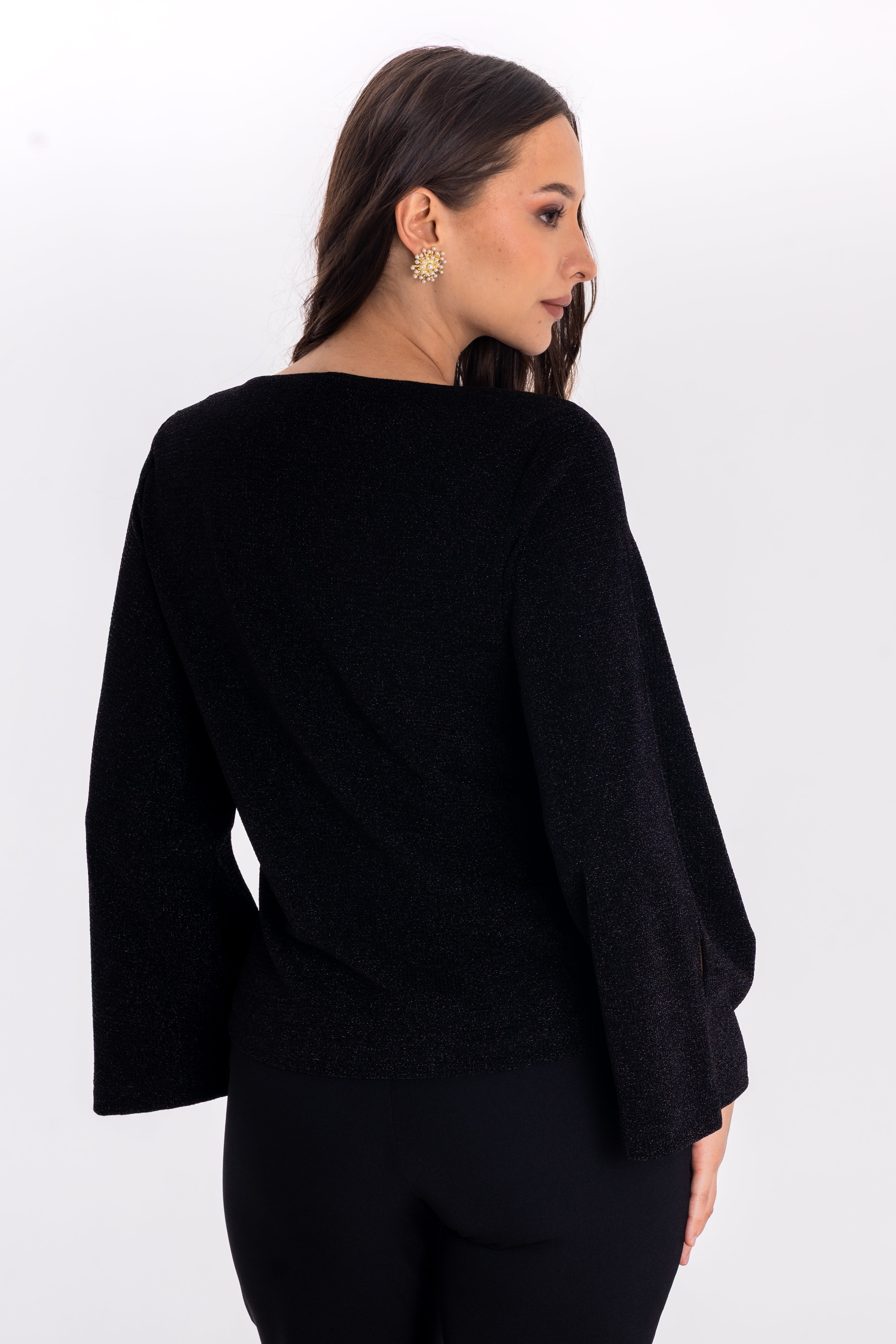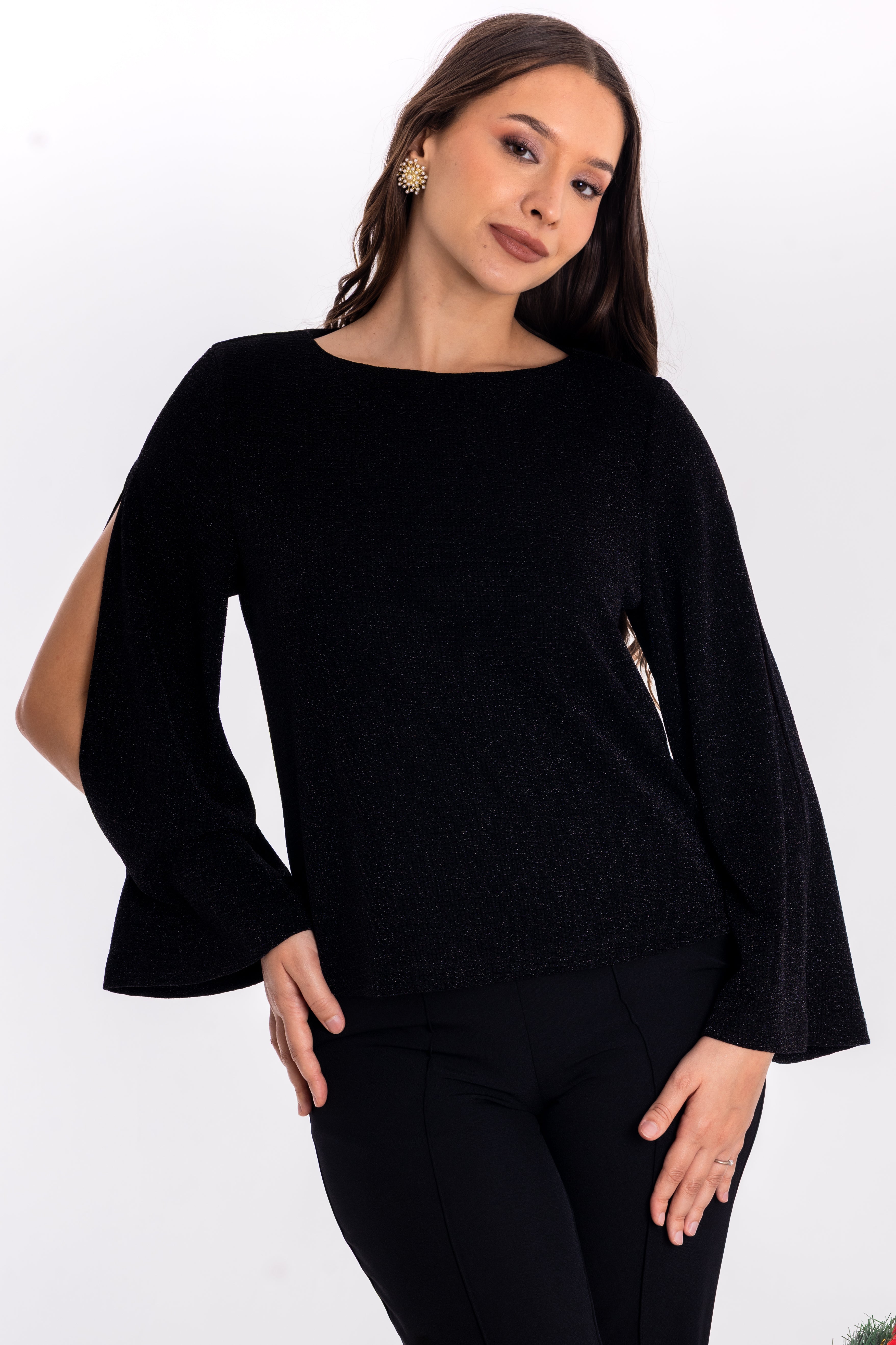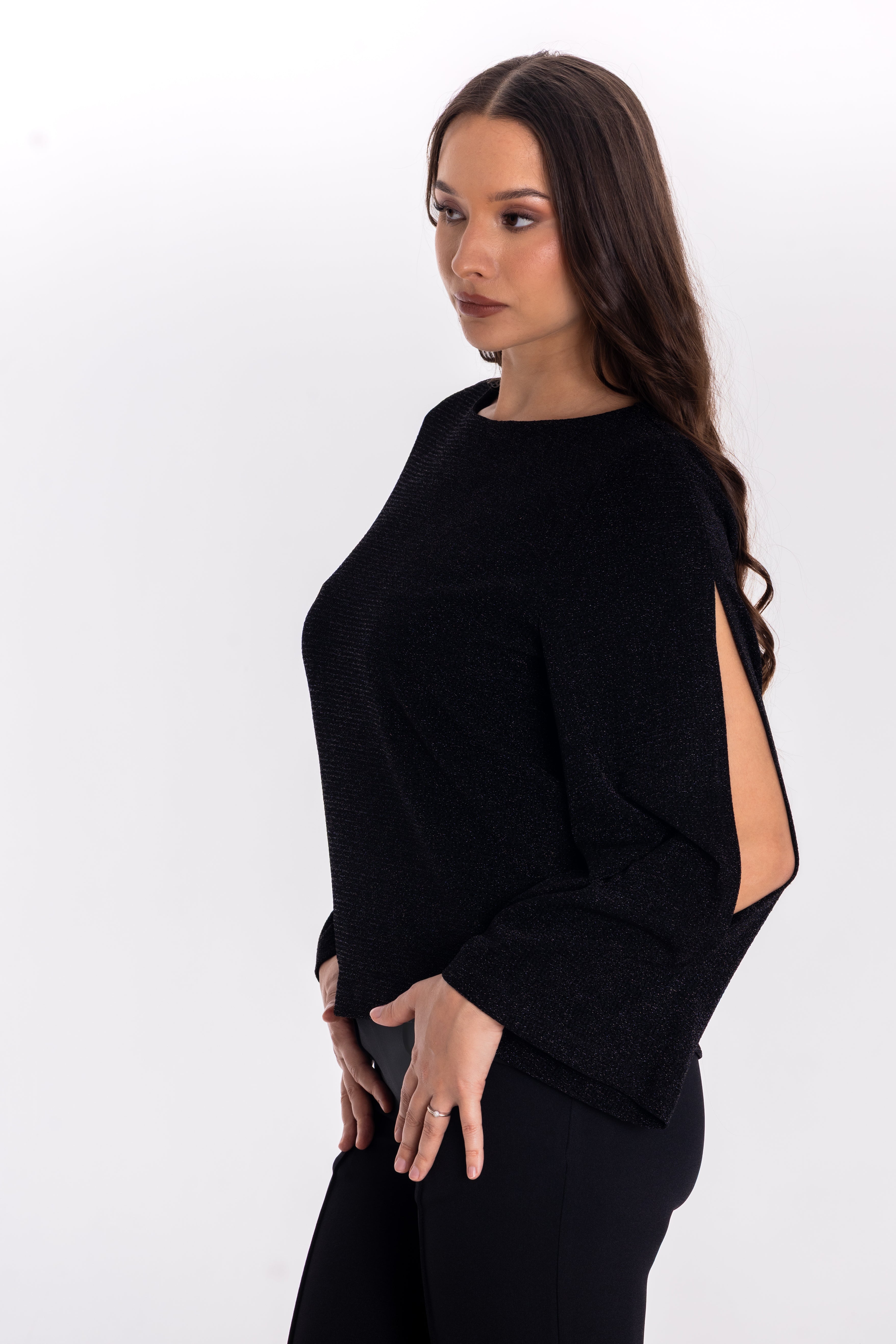 Elevate your evening wardrobe with a touch of celestial sparkle. This elegant black top feature a subtle shimmer-knit texture that catches the light beautifully. Designed with a clean boat neckline and a relaxed silhouette, the standout feature is the architectural split bell sleeves, offering a modern peek-a-boo detail that adds movement and drama to every gesture