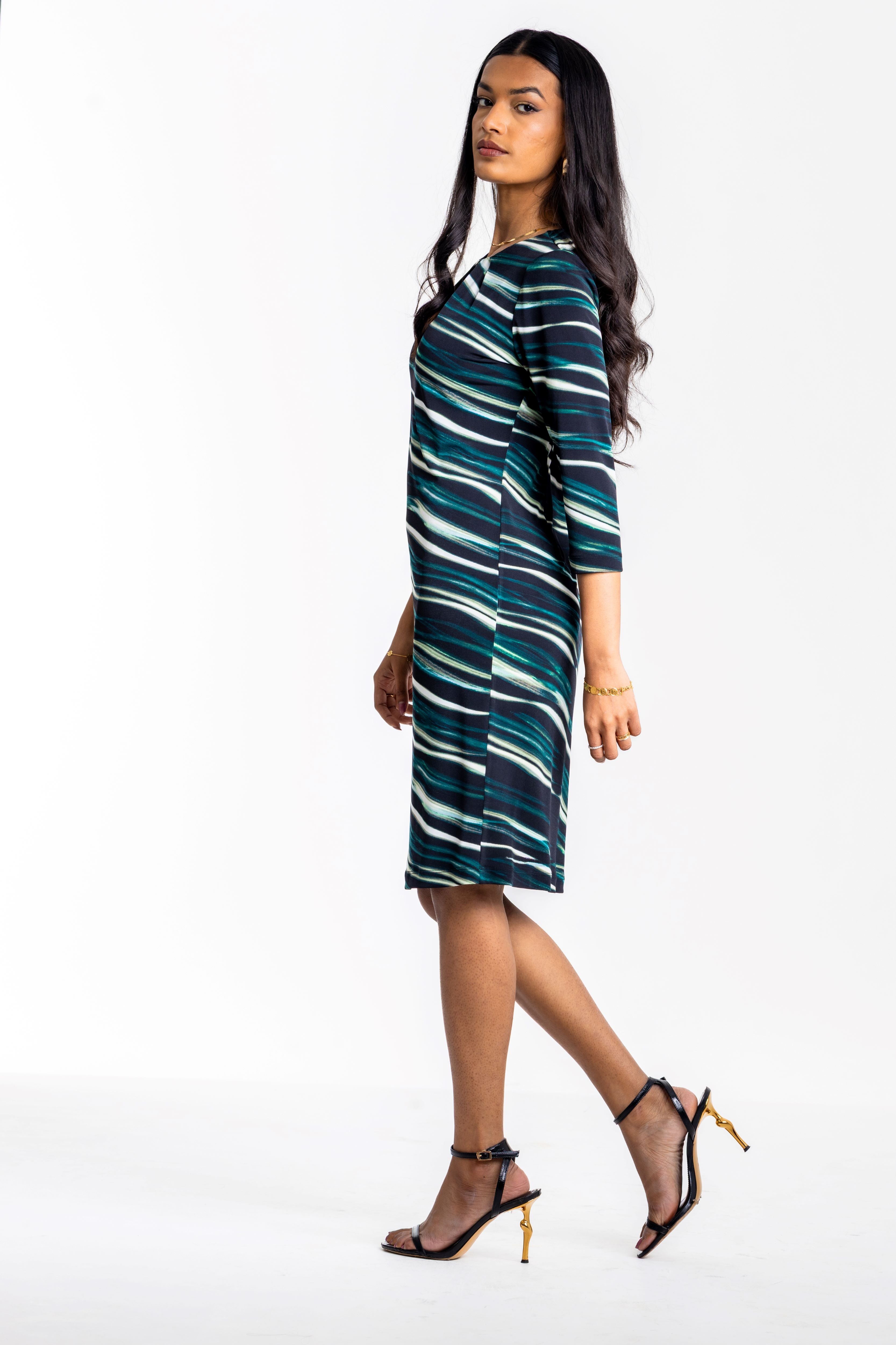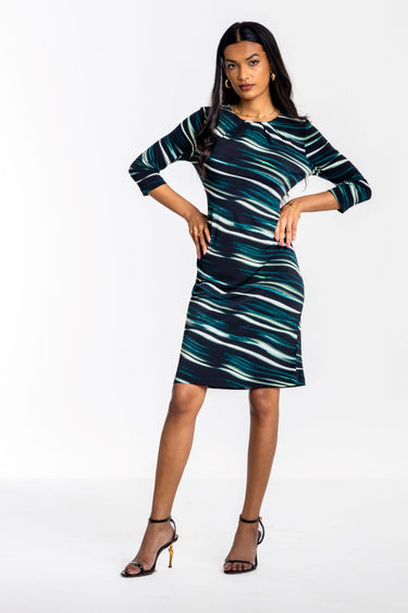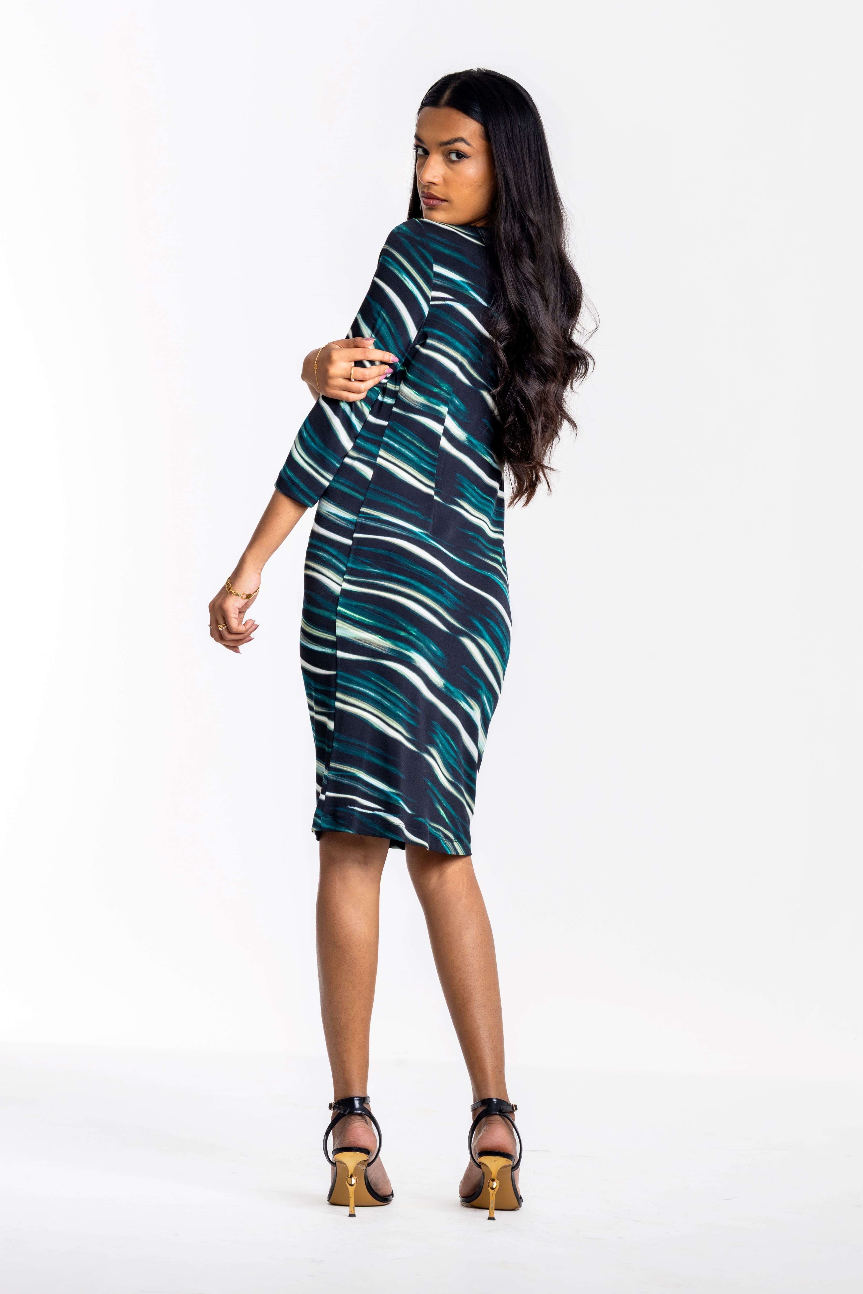 Command attention with the Emerald Drift Sheath Dress, a sophisticated piece that perfectly blends modern artistry with timeless elegance. This dress features a captivating abstract wave print in a stunning palette of deep emerald, rich teal, and crisp white, set against a chic black base.