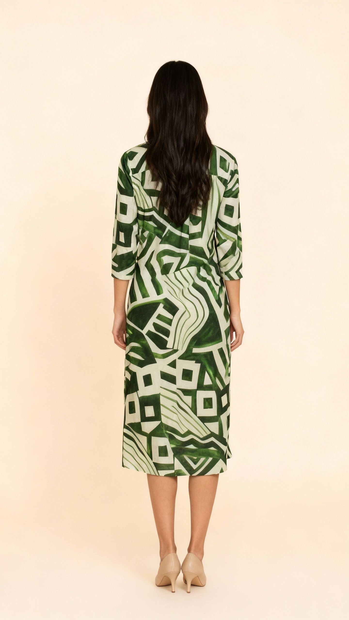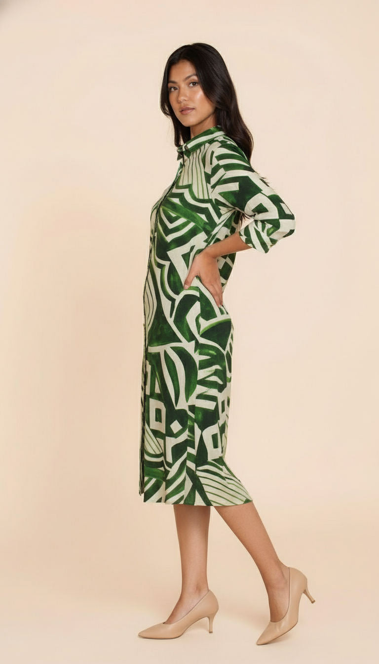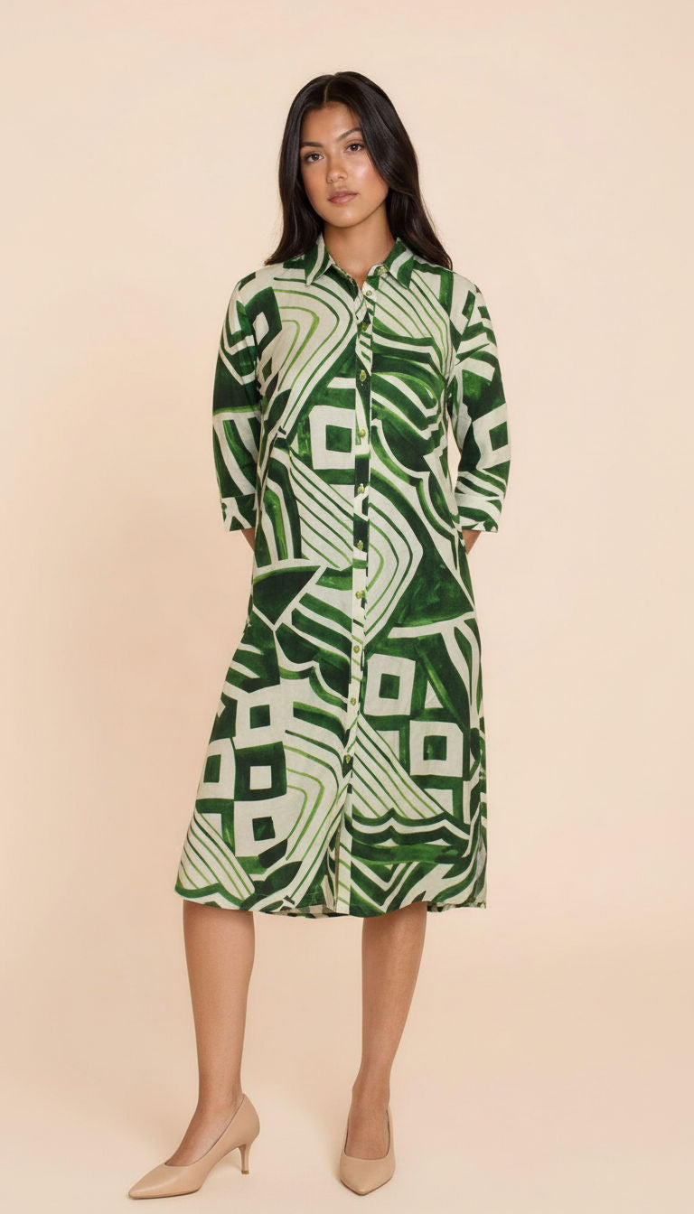 Step out in style with the Emerald Mosaic Shirt Dress, a fresh take on a classic silhouette. This effortlessly chic dress features a bold, abstract geometric print in deep emerald and lime greens against a creamy off-white background. The shirt dress style offers timeless appeal, complete with a classic collar, button-front closure, and comfortable three-quarter sleeves. Made from a soft, breathable fabric, it drapes beautifully to a flattering knee-length.