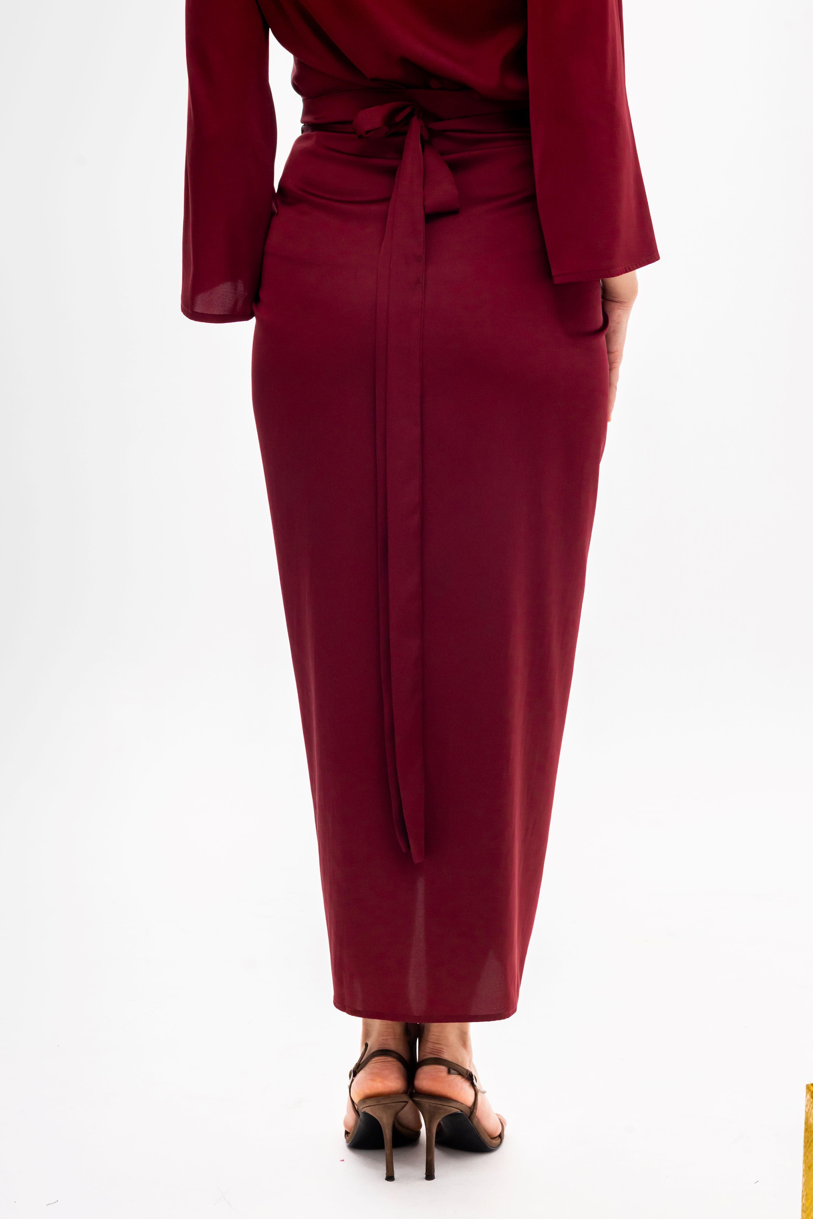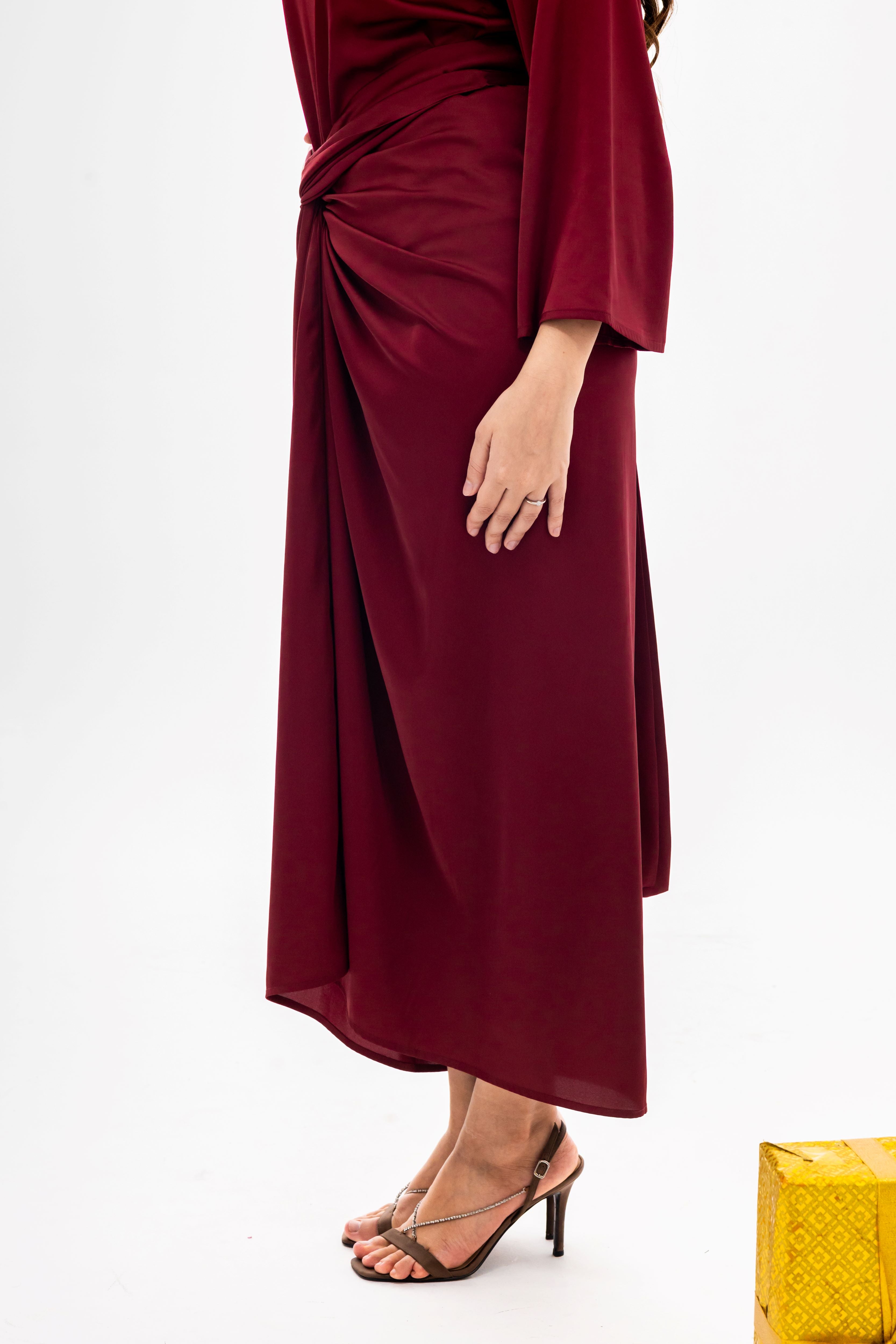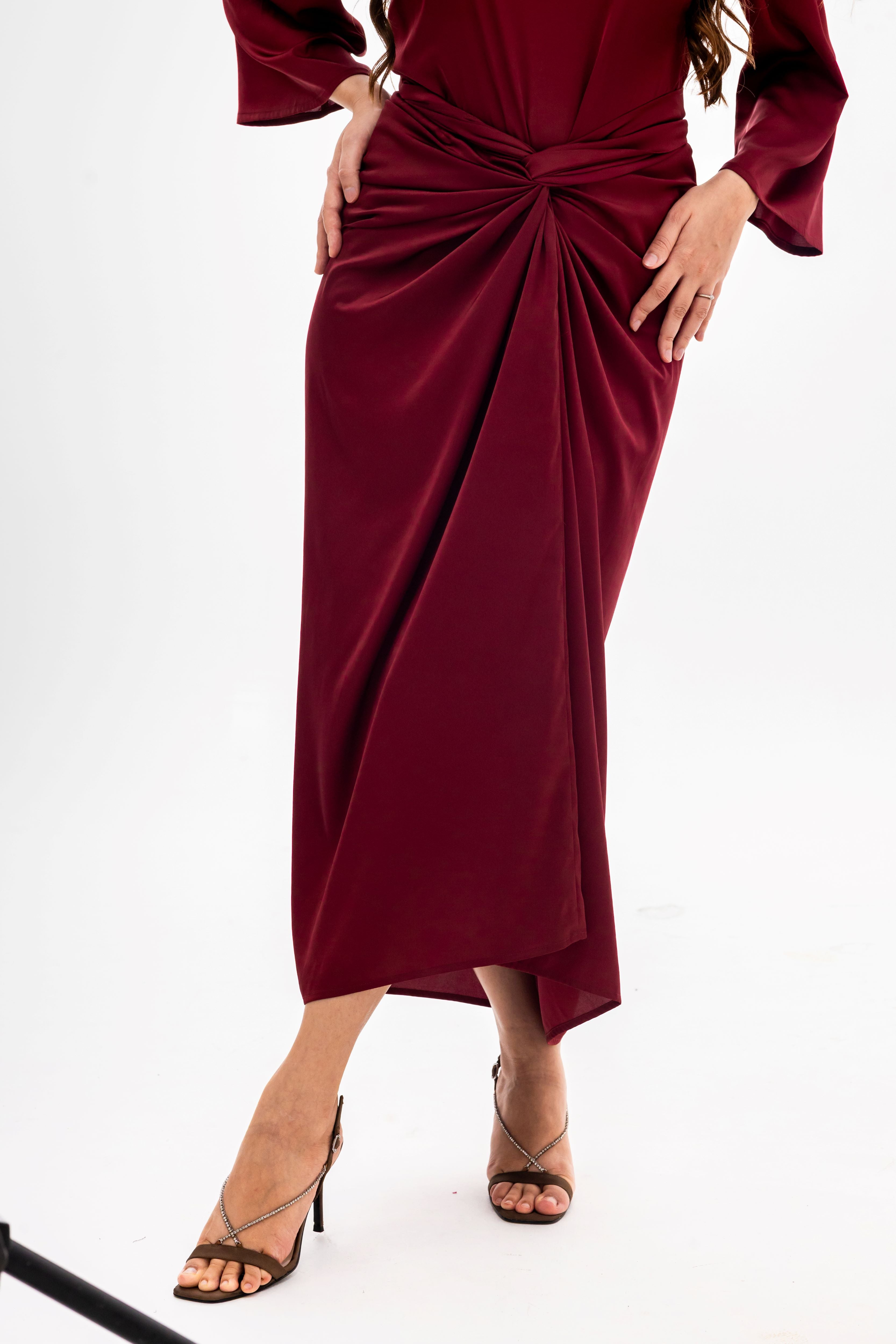 Introducing the Festive Knot Skirt—the centrepiece your wardrobe has been waiting for. Crafted in a luxurious, deep wine hue, this skirt commands attention with its dramatic yet refined aesthetic. The standout feature is the expertly executed front twist and knot detail, which creates an elegant, asymmetric drape and a figure-flattering silhouette.