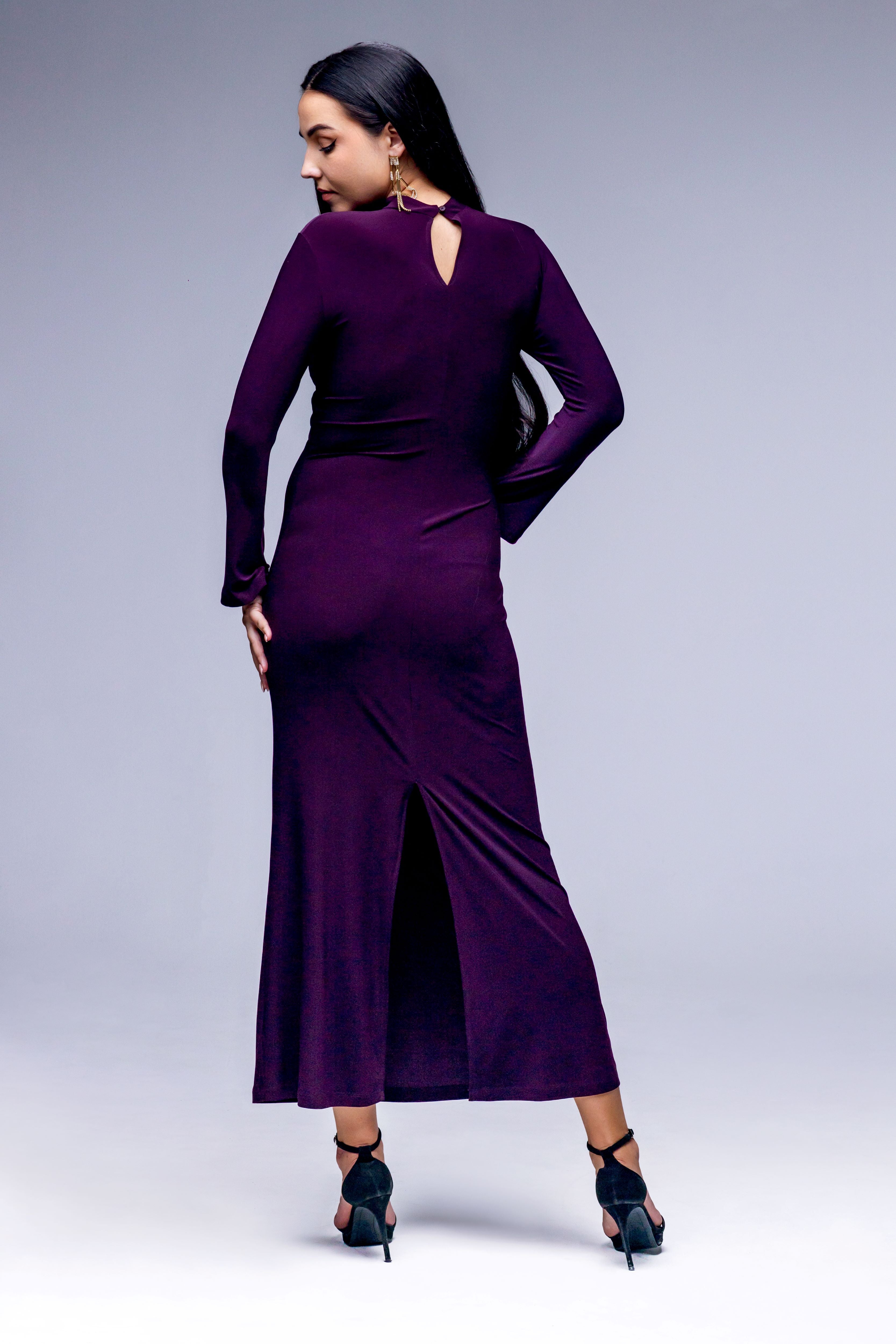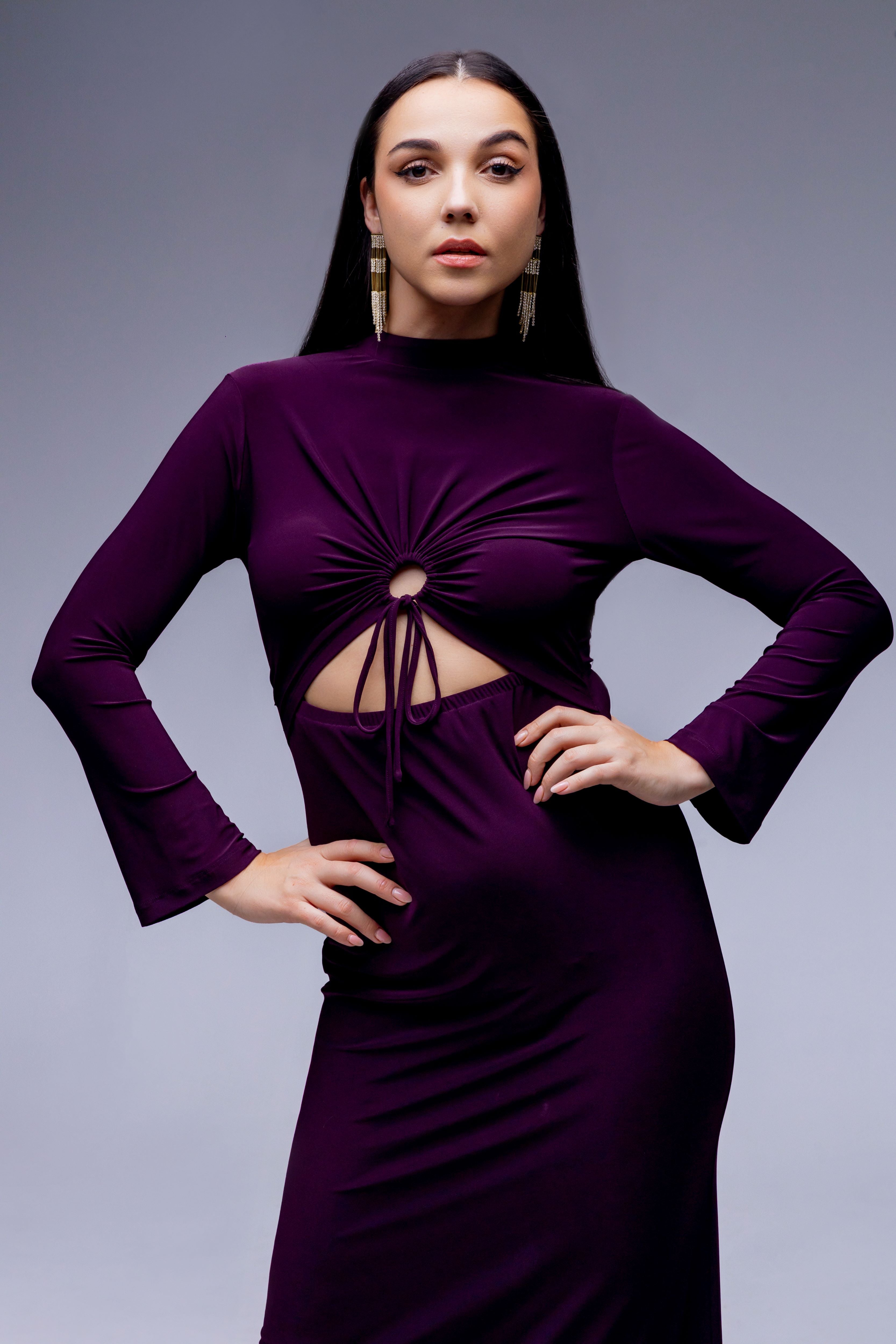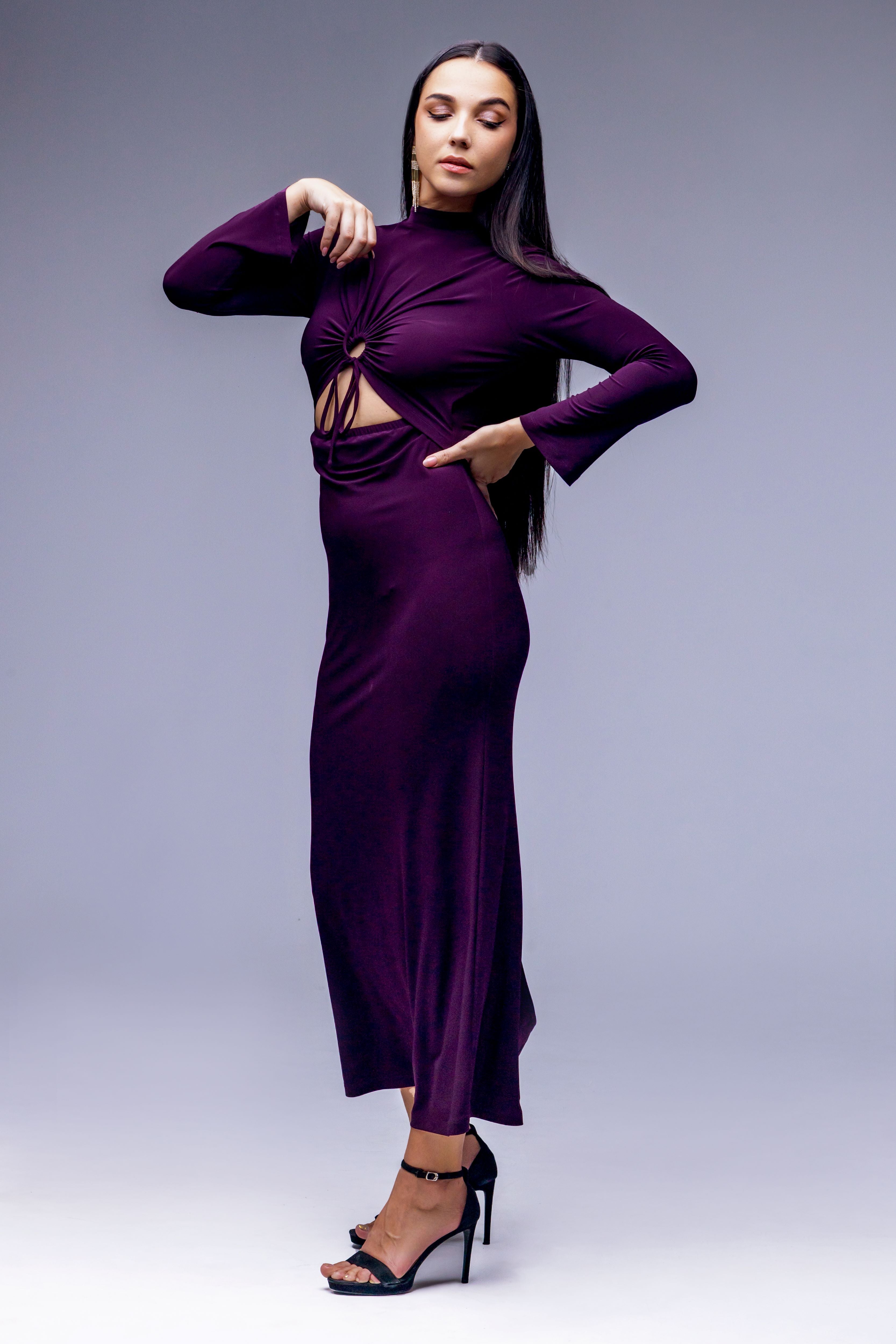 Embrace artistic elegance with this striking column-style dress. Featuring a unique watercolour-inspired dot print in deep indigo and neutral tones, this piece is designed for the modern trendsetter. The asymmetrical, one-shoulder neckline adds a contemporary edge, while the fluttering half-sleeves provide a relaxed yet sophisticated silhouette.
