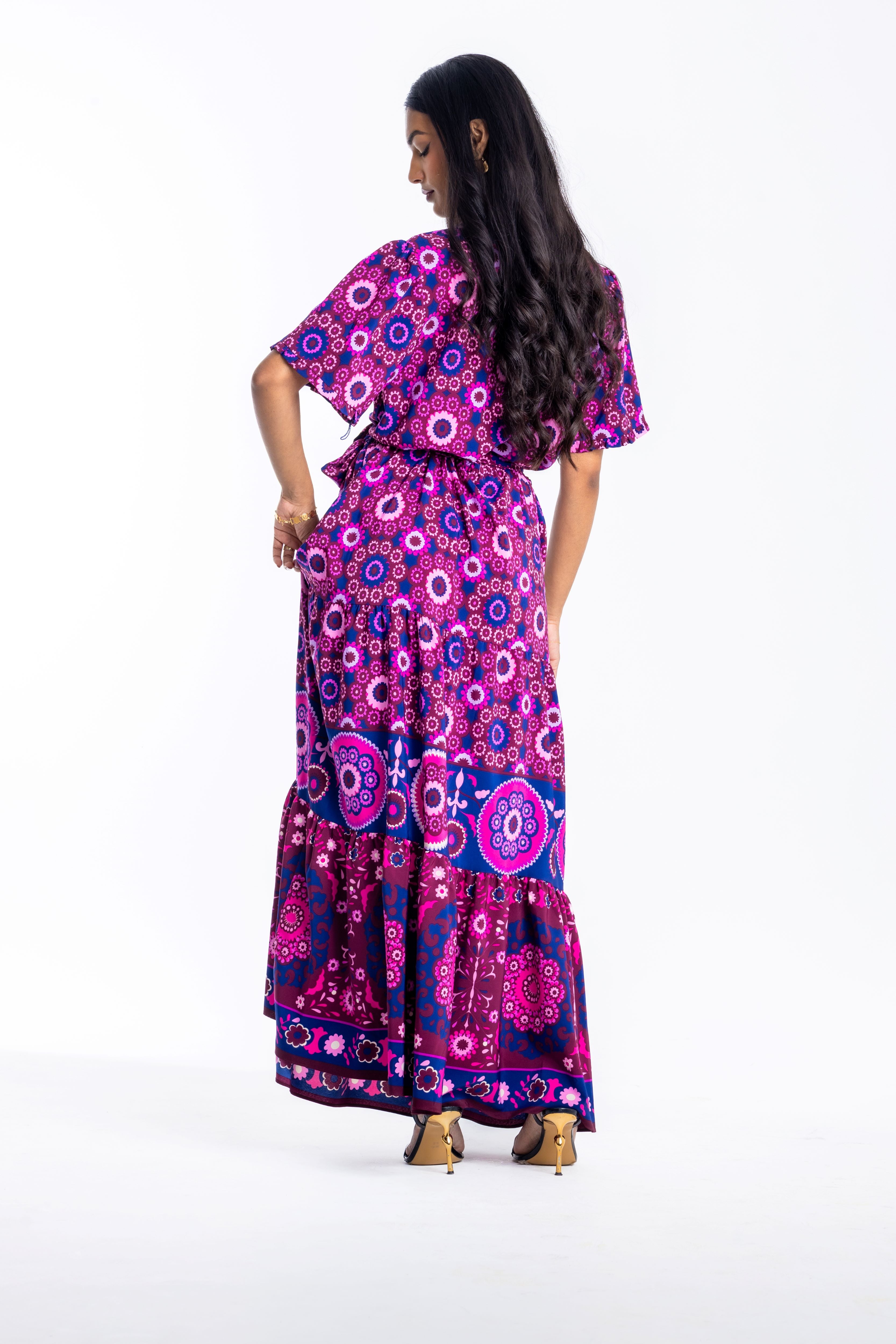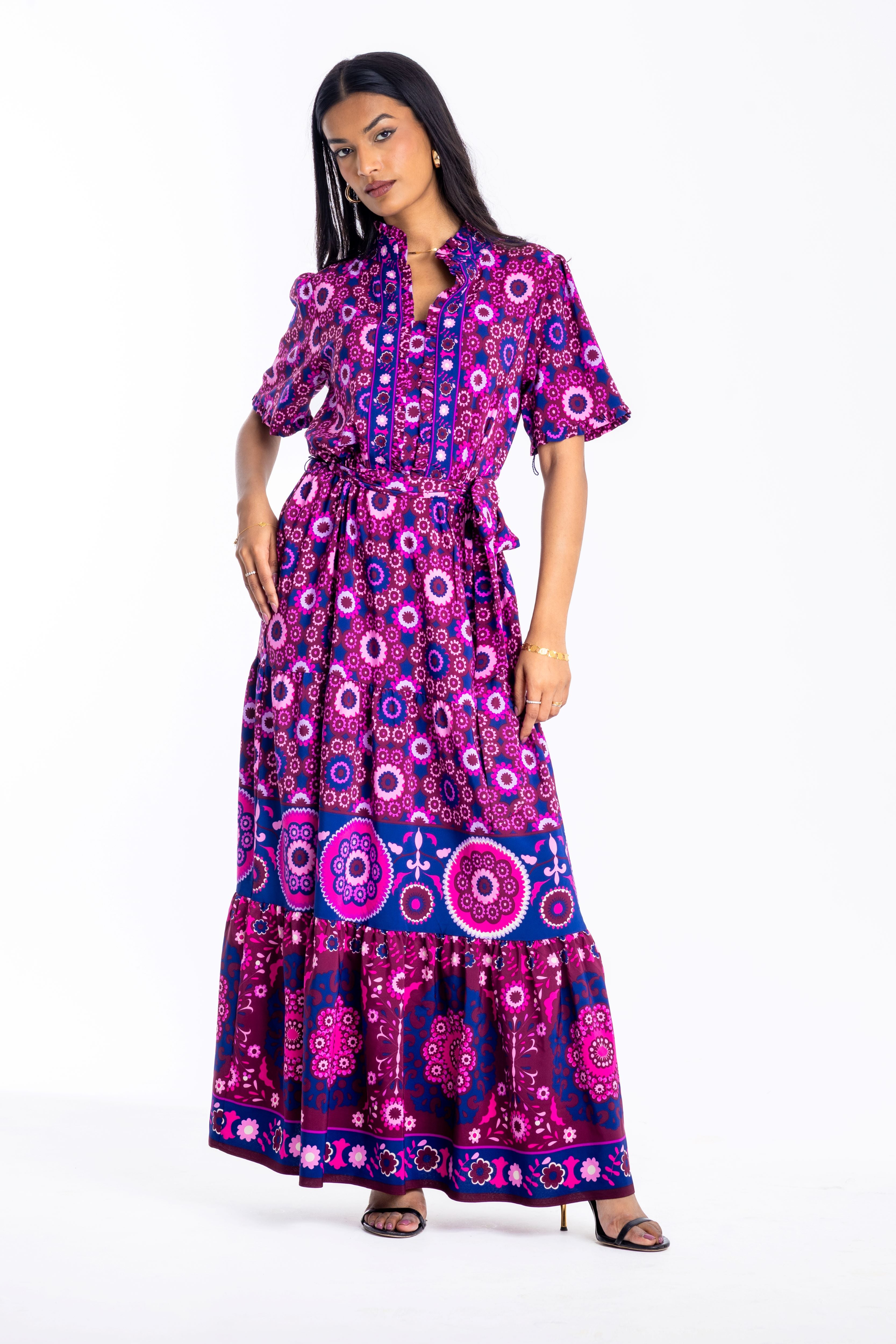 Embrace a bold, bohemian aesthetic with this floor-sweeping maxi dress. Featuring an intricate magenta and blue mandala-inspired print, this piece is designed for maximum impact. The ruffled V-neckline and short sleeves offer a feminine touch, while the self-tie belt allows you to define your waist for a flattering silhouette.