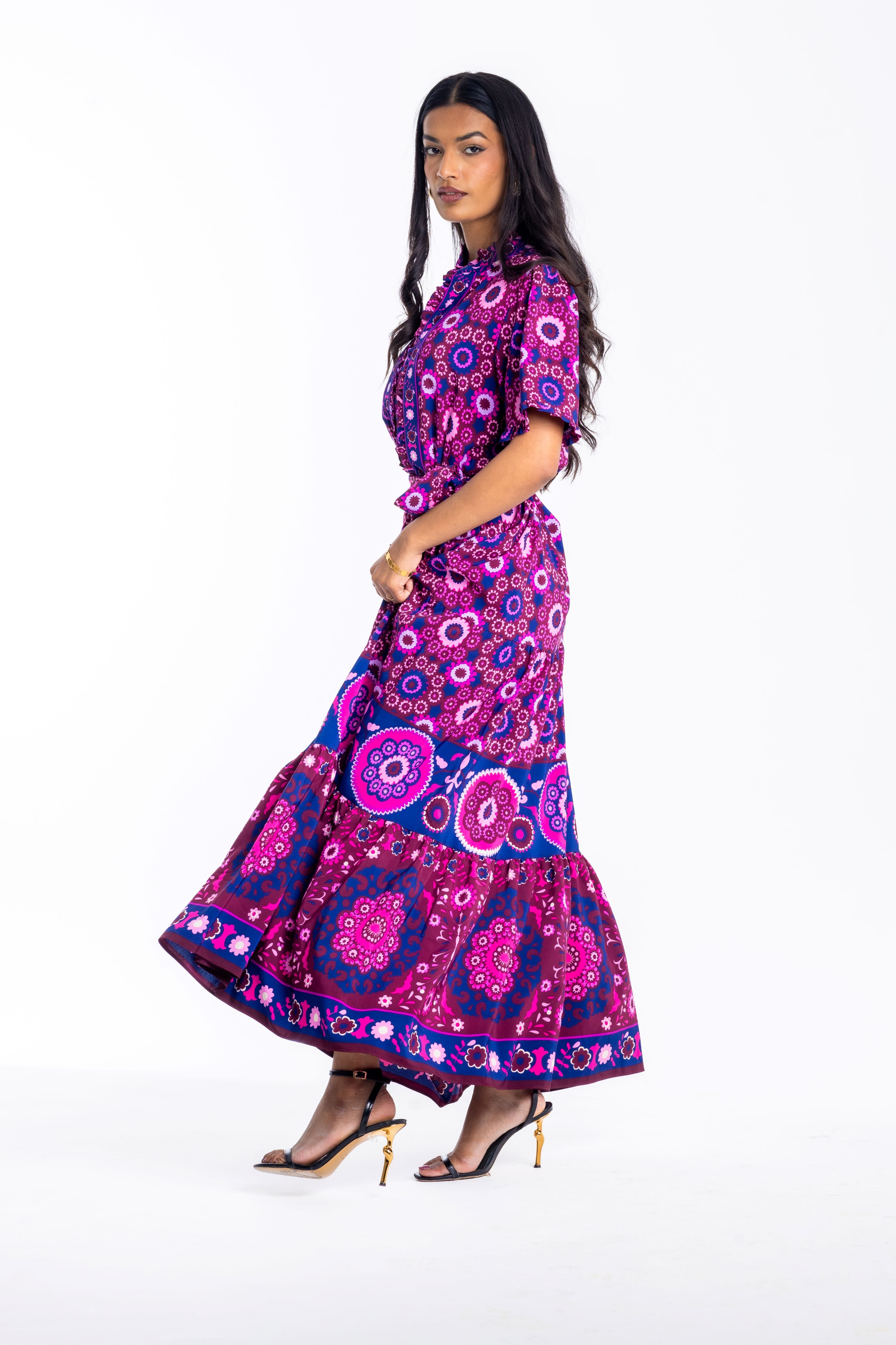 Magenta Mandala Ruffle Maxi Dress