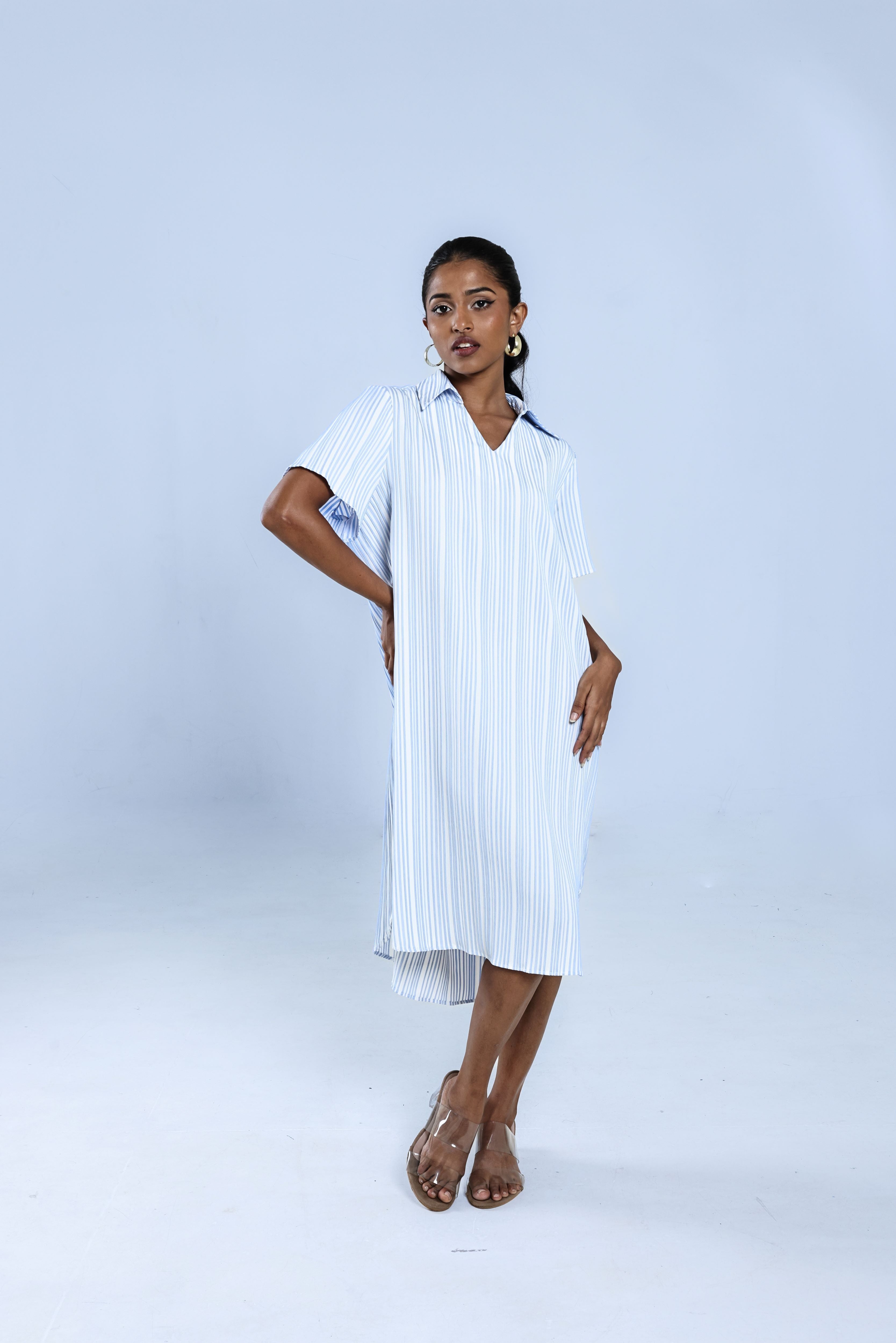 "A fusion of comfort and contemporary style, our Riviera Stripe Kaftan Dress is a must-have for your versatile wardrobe. The classic blue and white stripes provide a fresh, crisp look, while the dropped shoulder and open collar add a modern edge. Its relaxed, free-flowing silhouette makes it an excellent choice for a variety of occasions – from a relaxed day out to a stylish poolside lunch. Dress it up with wedges or keep it casual with flats.