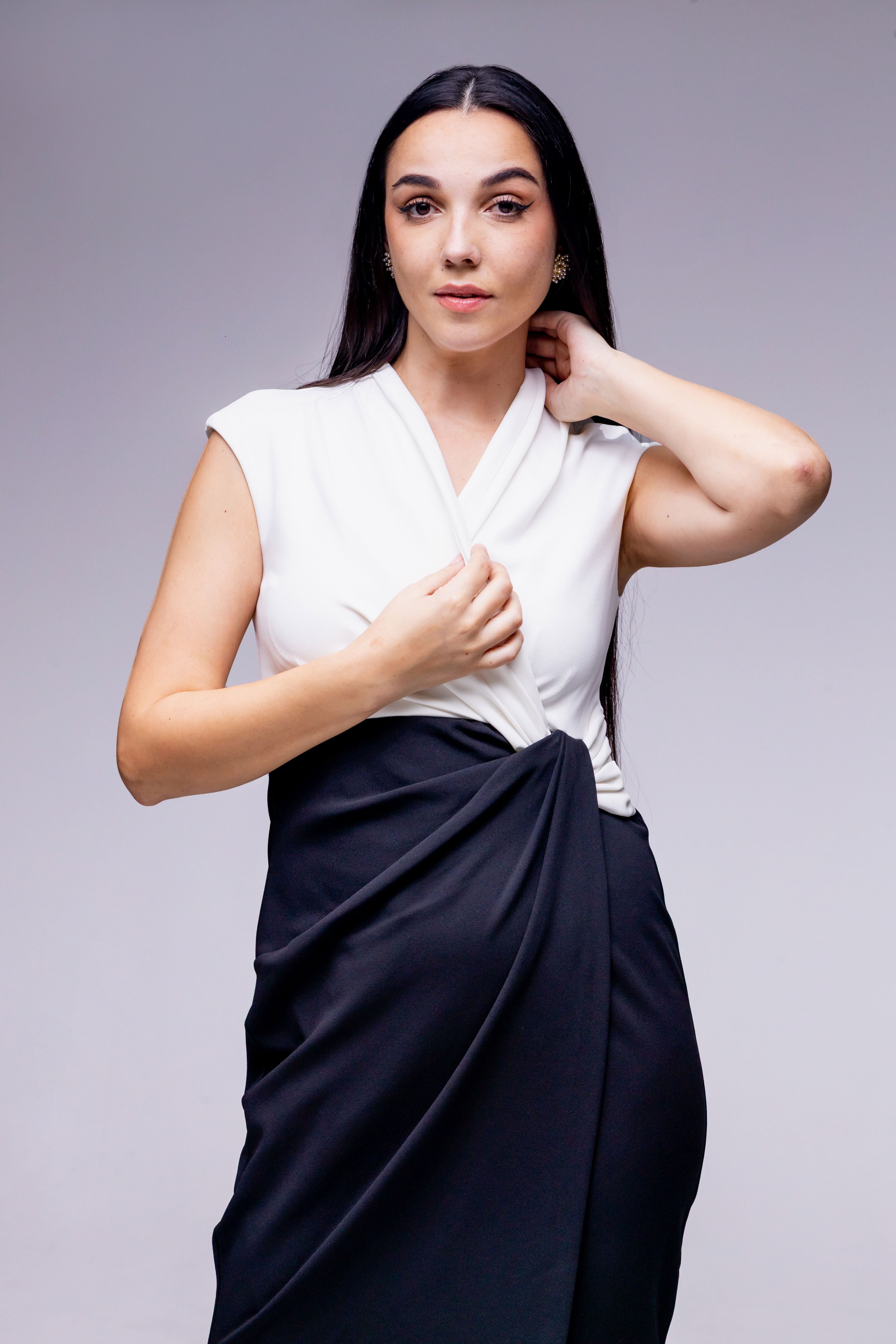 This sophisticated two-tone piece features a crisp white surplice bodice with a flattering V-neckline and elegant cap sleeves. The design seamlessly transitions into a structured black skirt, featuring a dramatic side-drape that creates a soft, tulip-style silhouette.