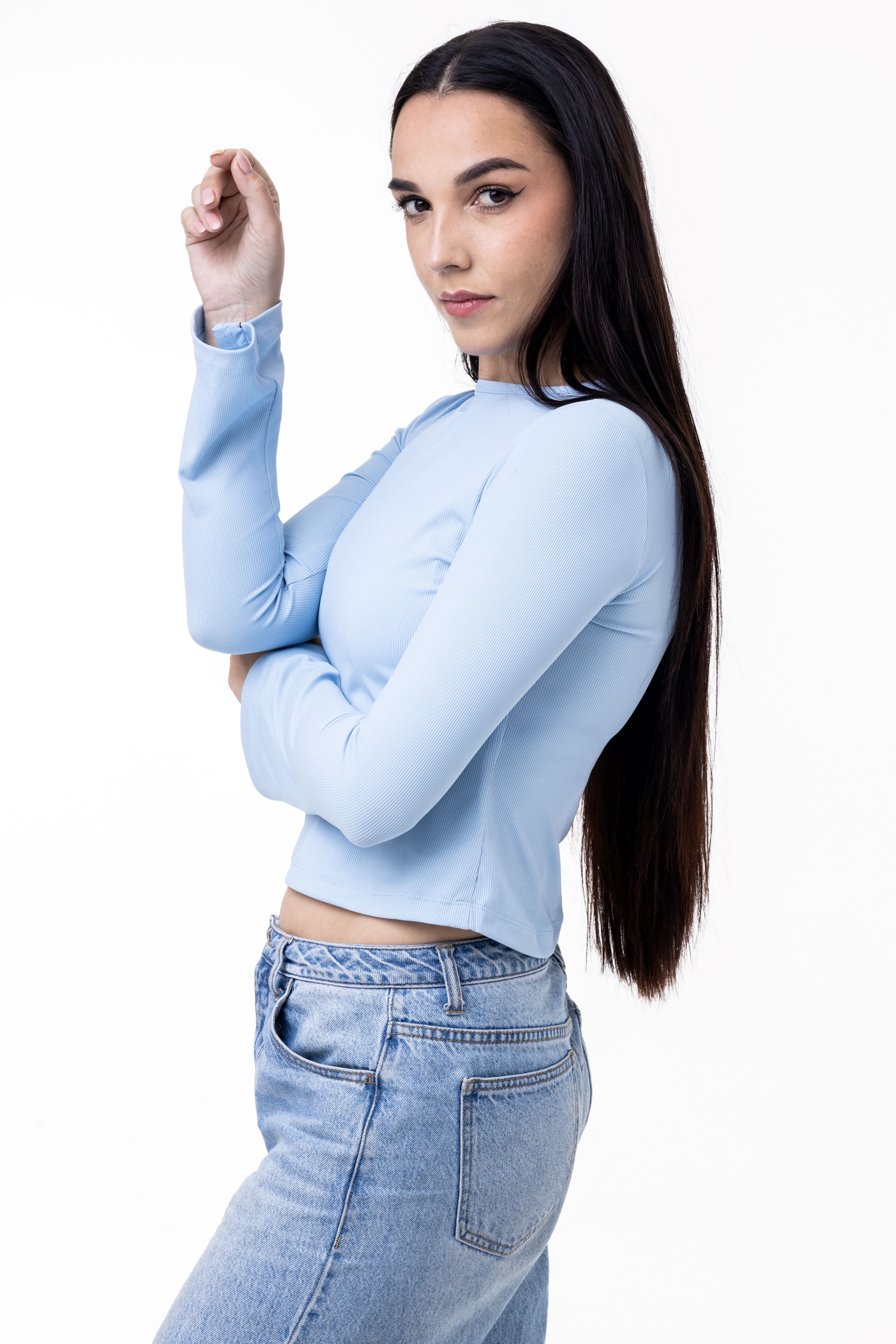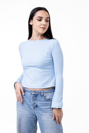 Meet your new favourite base layer. This sky-blue long-sleeve top combines a classic crew neckline with a subtly cropped hem for a look that is both timeless and on-trend. Made from our signature ribbed knit fabric, it provides a body-hugging fit that feels soft against the skin while offering plenty of stretch.