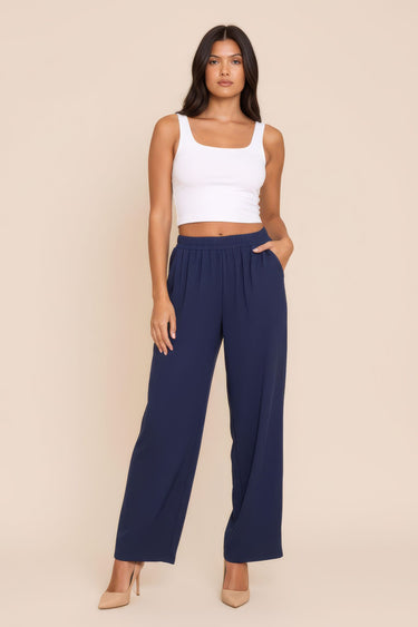 Made from a soft, fluid fabric in a deep Midnight Navy hue, they feature a flattering high-rise fit and a smooth elasticized waistband that eliminates the need for zippers or buttons. Subtle pleating at the waist provides a beautiful drape and structure, flowing down into a chic wide-leg silhouette. They're wrinkle-resistant and incredibly versatile—dress them up with heels and a blouse for a night out or pair them with a simple tee and sandals for relaxed weekend style. Side pockets add perfect functionality.