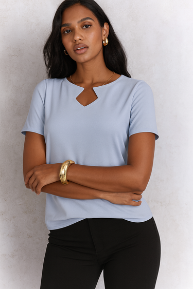 Our Effortless Essential Top is a must-have for a curated wardrobe. This light blue top feature a clean, V-notch neckline and a subtle front seam detail that creates a polished, elongated look. Made from a durable, wrinkle-resistant blend, this top offers a flowy fit without sacrificing structure. Its timeless design and versatile colour make it the perfect foundation for countless outfits.