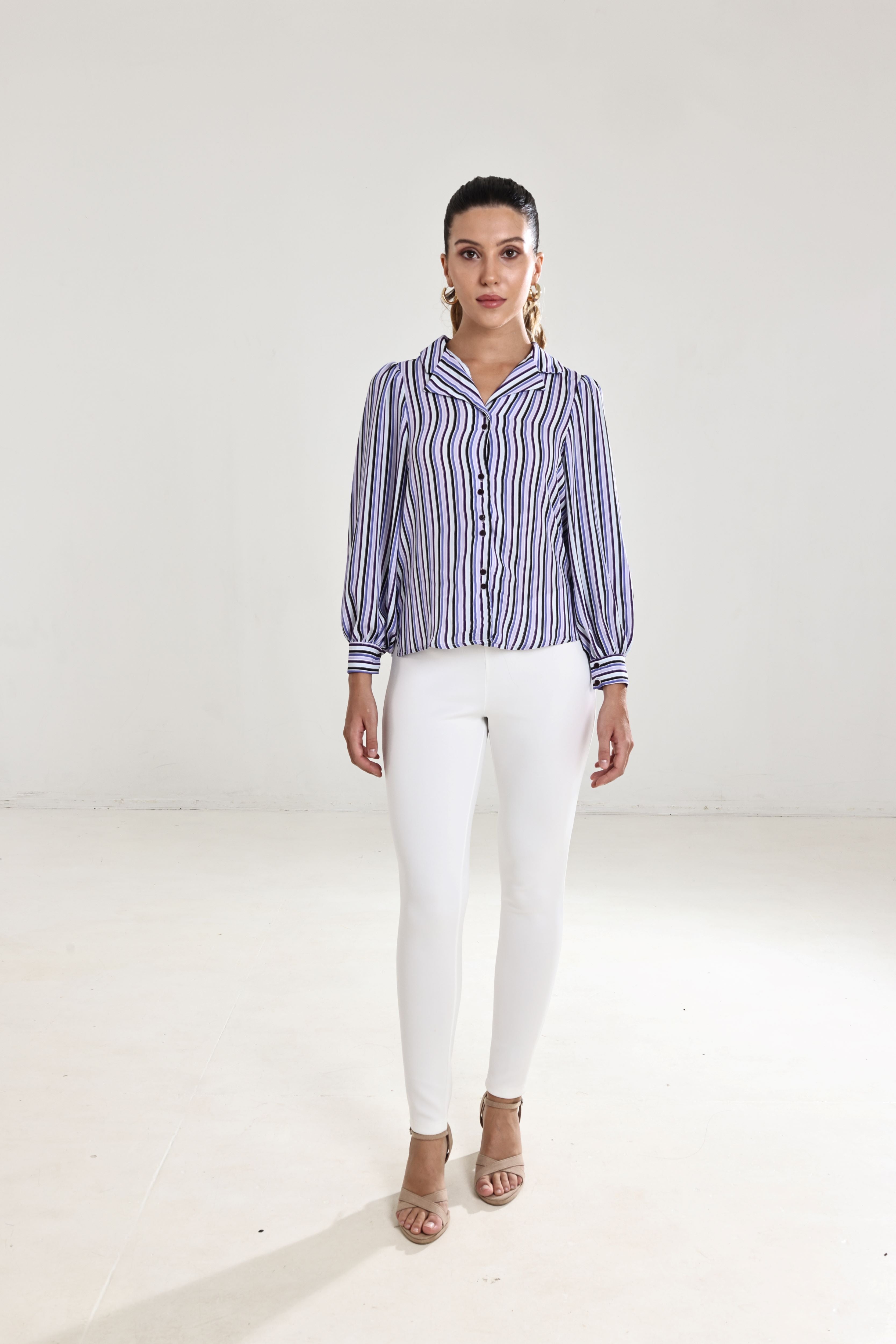 "Add a touch of timeless charm to your wardrobe with this striped button-down blouse. Featuring a sophisticated notched collar, long bishop sleeves, and a relaxed fit, this top blend comfort with effortless style. The classic vertical stripes in a mix of neutral and bold hues create a flattering silhouette, perfect for both office wear and casual outings.