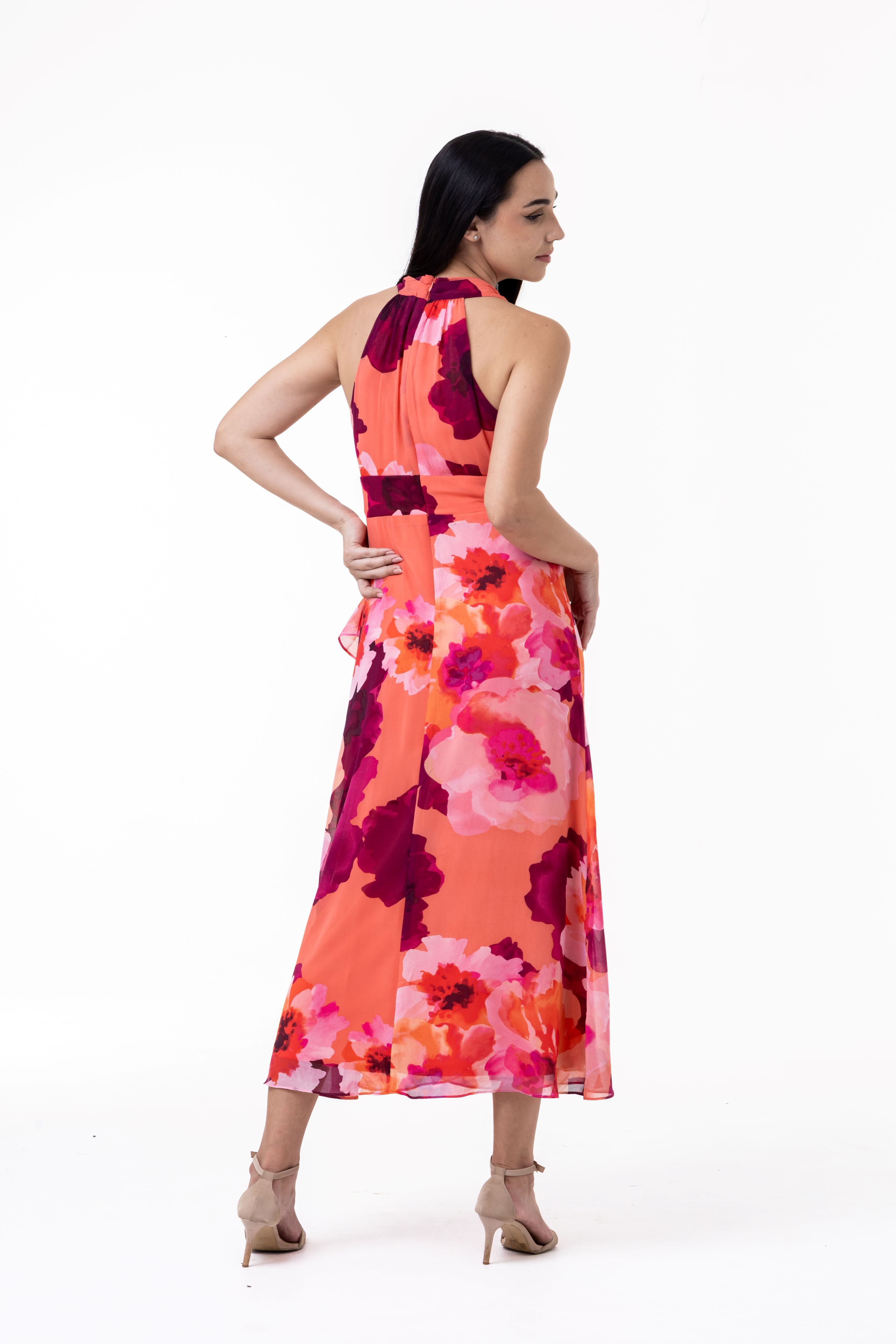 Designed for the woman who loves to make an entrance, this vibrant midi dress features a breathtaking oversized floral print in shades of nectarine, magenta, and soft coral. Crafted from a light, airy chiffon, the silhouette is defined by a sophisticated wrap-style bodice and a graceful halter neckline that highlights the shoulders.