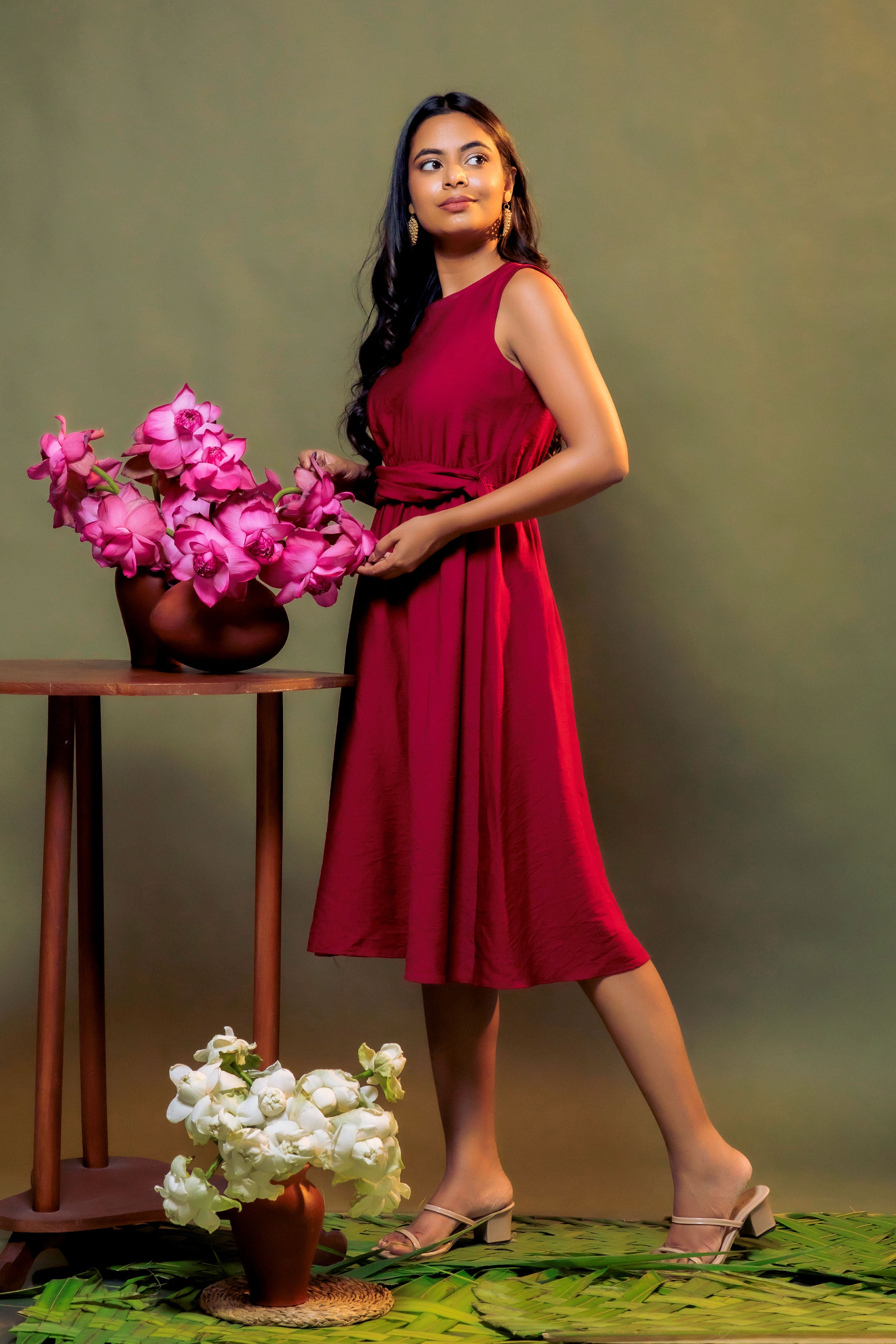 Master the art of understated glamour. This sleeveless midi dress features a vibrant berry-red hue and a signature knotted waist detail that provides a custom-feel fit. The gathered bodice and flowing A-line skirt create a balanced, feminine silhouette that moves gracefully from day to night.