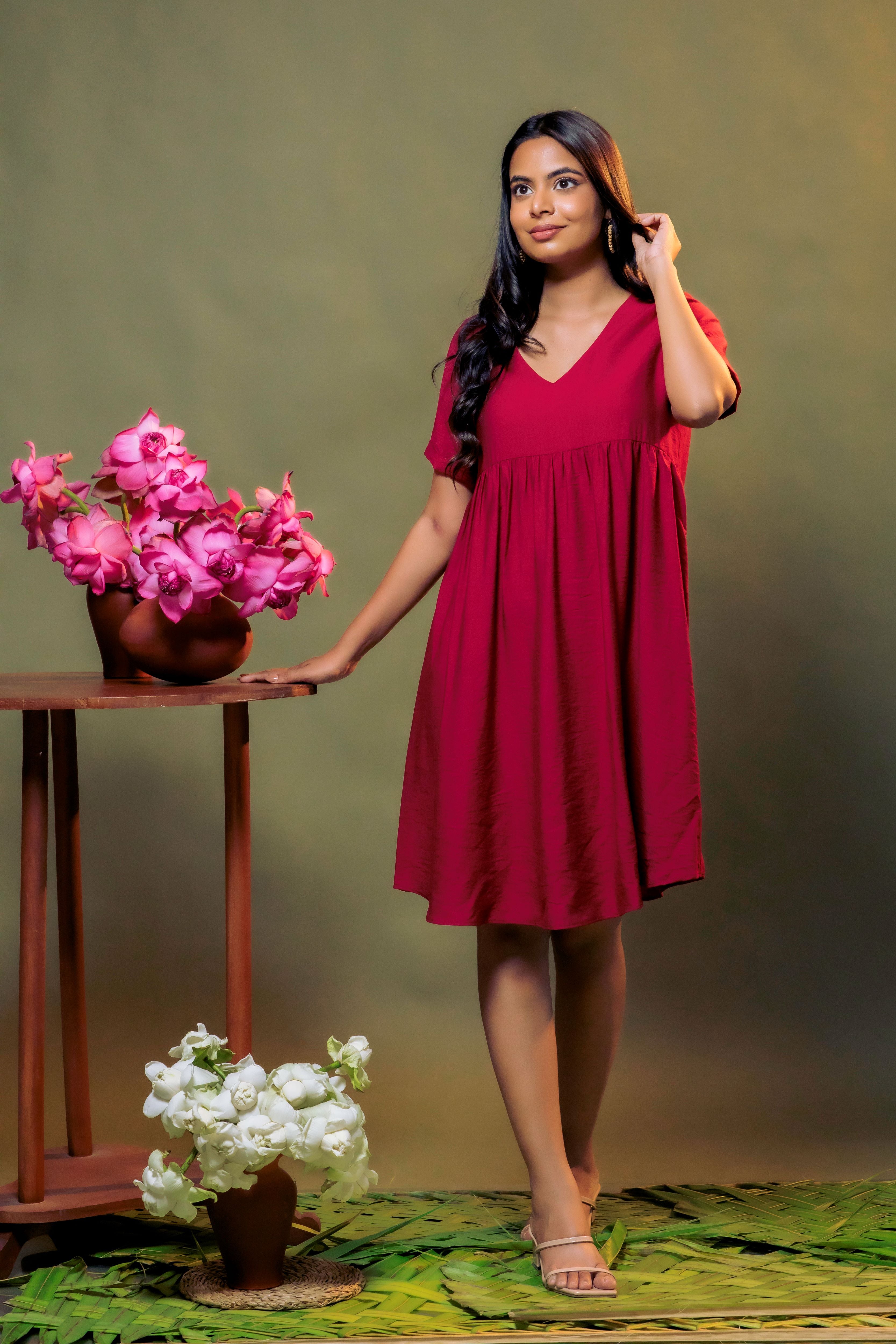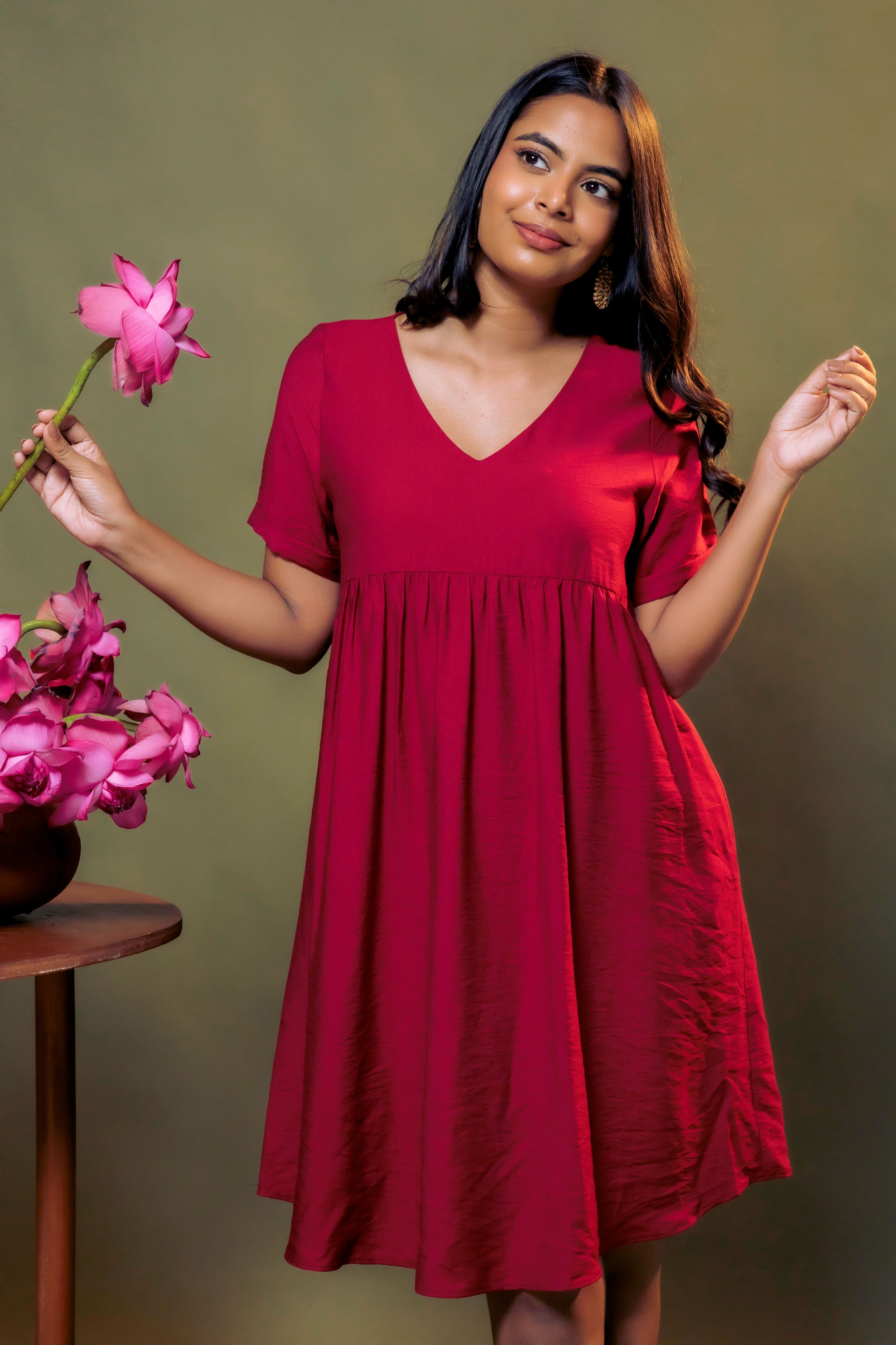 Sweeten your wardrobe with this charming, high-volume silhouette. Featuring a flattering empire waist and gentle gathers, this top offers a relaxed, airy fit that’s perfect for warmer days. The deep V-neckline adds a touch of sophistication to its otherwise playful "fit-and-flare" shape.